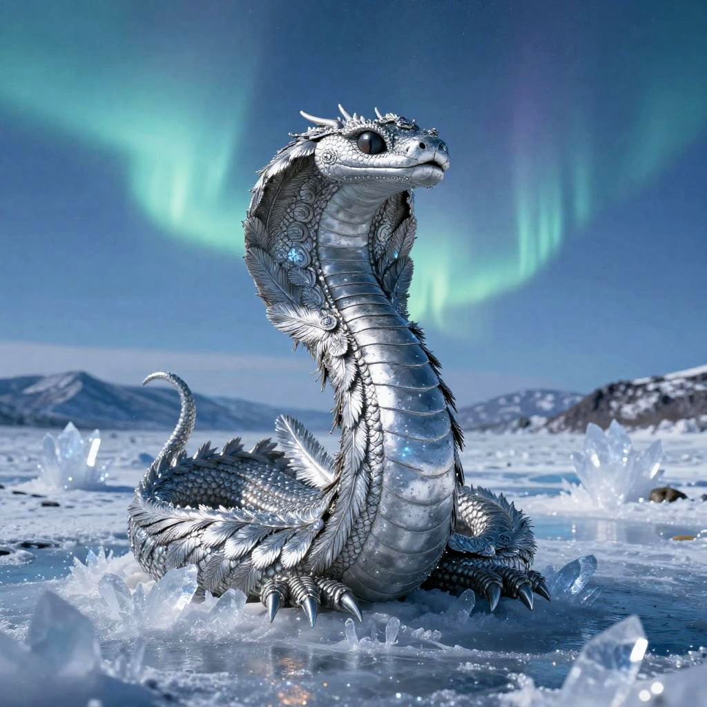 Digital artwork of a silver, scaly dragon with a cobra-like hood, sitting on an icy Arctic landscape under vivid green Northern Lights.