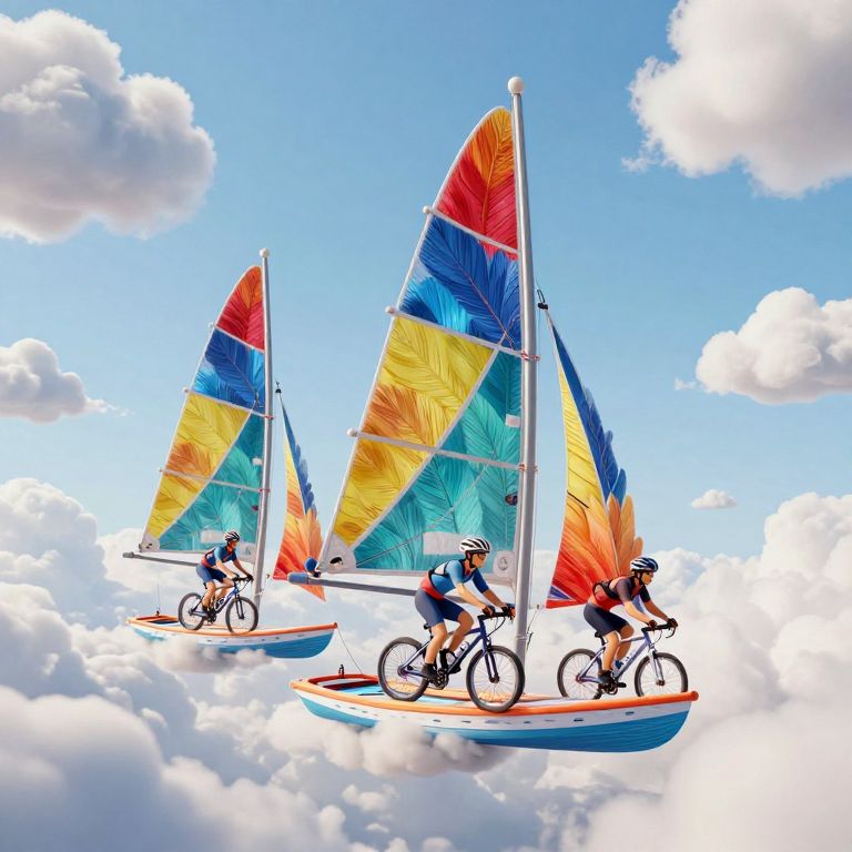 A surreal 3D-rendered scene depicts cyclists pedaling on sailboats adorned with vibrant, feathered sails, defying gravity as they glide through a dreamlike sky filled with fluffy clouds, evoking a whimsical and imaginative artistic style.