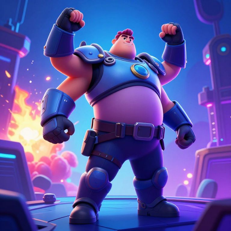 Fortnite fat hero standing triumphantly on a digital battlefield, exaggerated body shape with defined details, dynamic lighting with blue and purple hues, futuristic armor, vibrant explosions in the background, detailed environment with floating platforms, high contrast, stylized realism