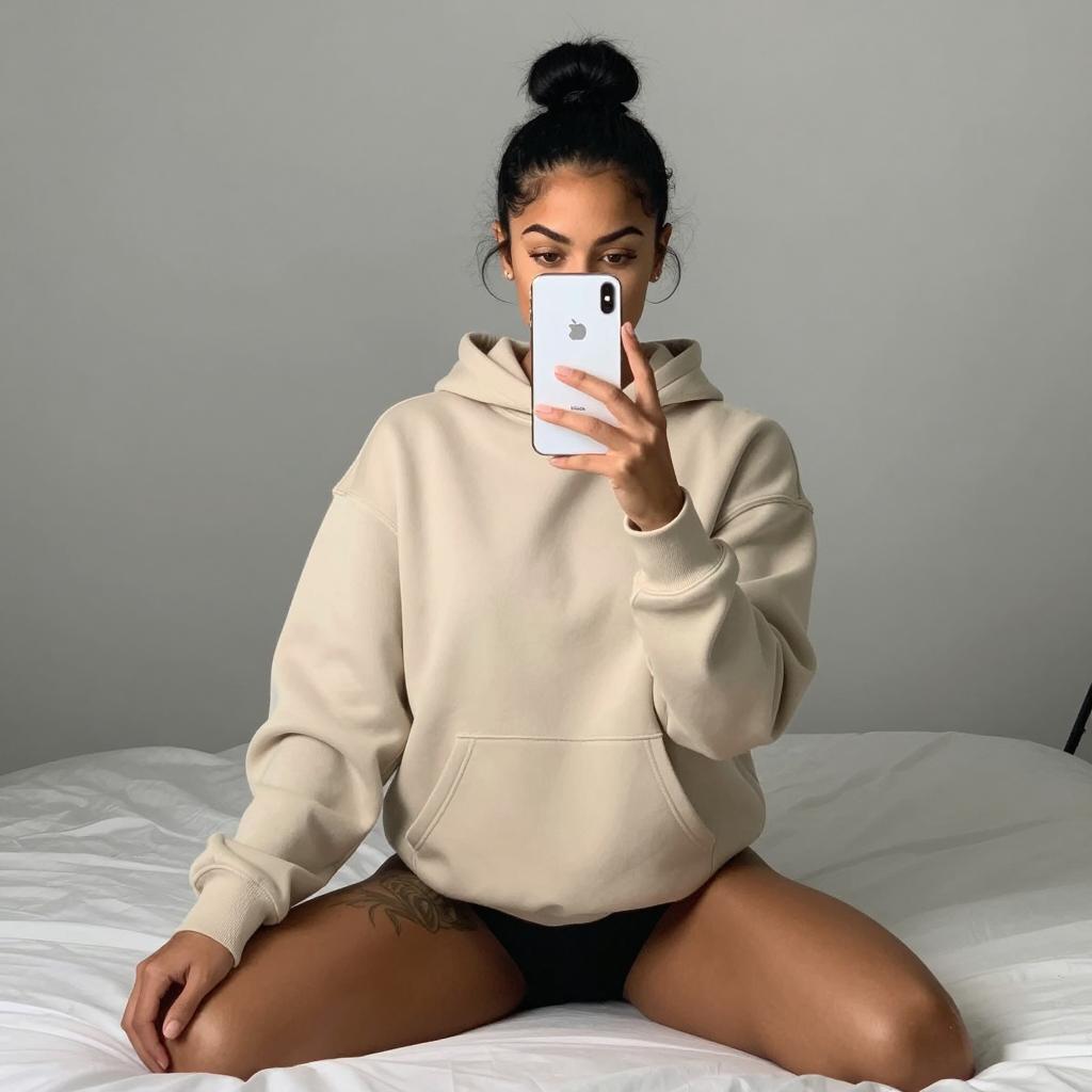 Young woman with light brown skin and curly hair in a high bun, wearing floral lace lingerie with a bow and straps. She holds a blue smartphone in her right hand, taking a mirror selfie. Her left hand rests on her thigh. She wears gold hoop earrings. The background is a plain, light-colored wall. Her expression is neutral. She is standing and slightly leaning forward.