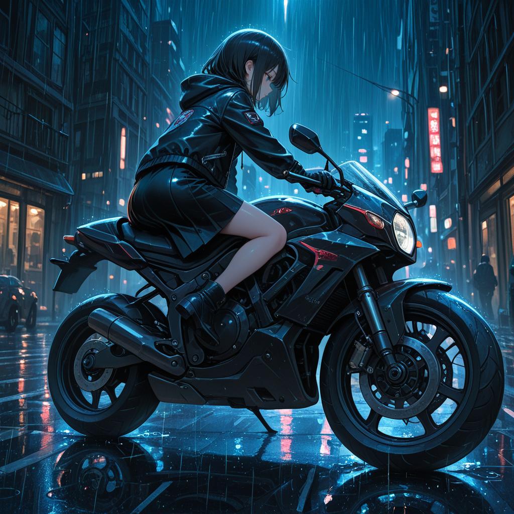 1girl, dress, jacket, rain, ground vehicle, mecha, motor vehicle, motorcycle, on motorcycle, vehicle focus, wheel, night, road, street, city, puddles, Masterpiece, best quality, pixel