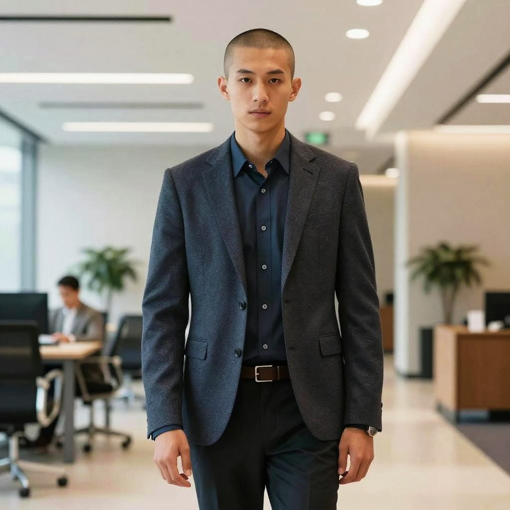 Shaved Head hairstyle on female artist, wearing paint-splattered smock, in art studio, captured in fashion editorial style with soft natural daylight.