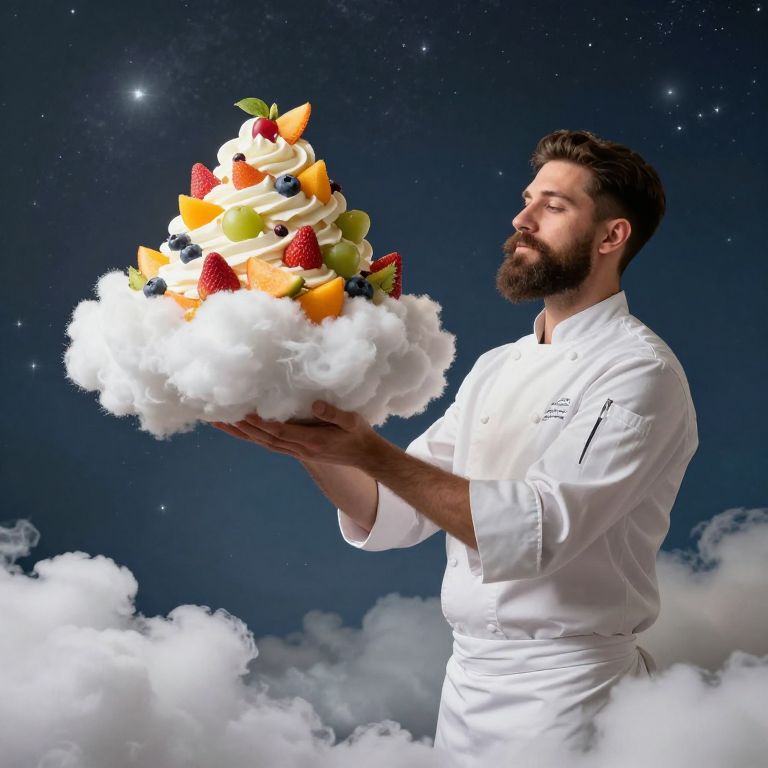 A bearded chef in a pristine white uniform stands serenely amidst a celestial backdrop, presenting a towering, cloud-like dessert adorned with vibrant fruits and delicate cream, defying gravity as it floats ethereally above the clouds.