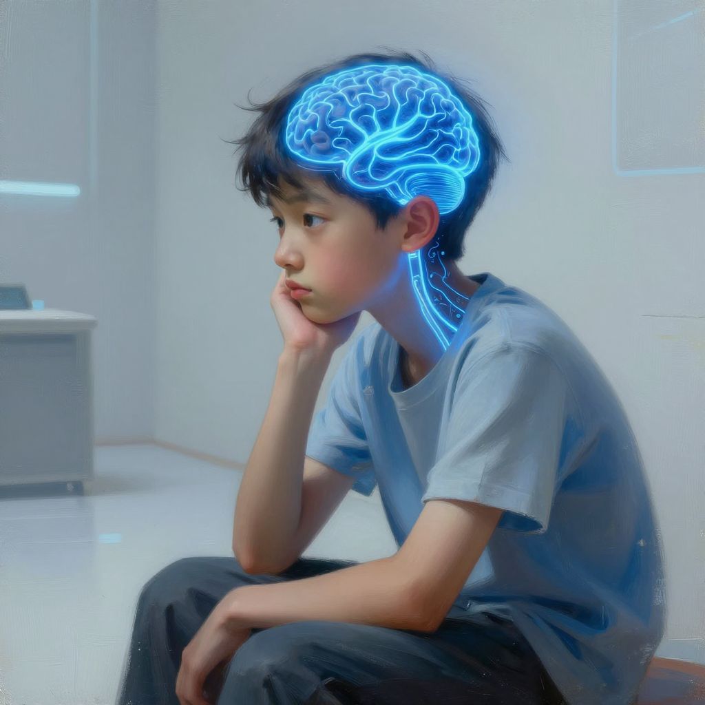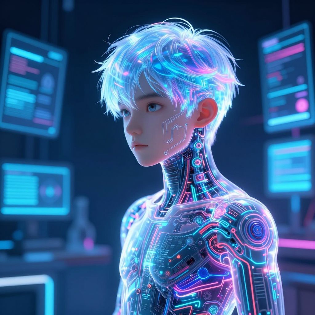 AI boy art, futuristic young boy with glowing neural circuits integrated into his face and arms, soft pastel color palette, digital painting style, surrounded by abstract data streams in a cyberpunk cityscape, intricate details, soft lighting.