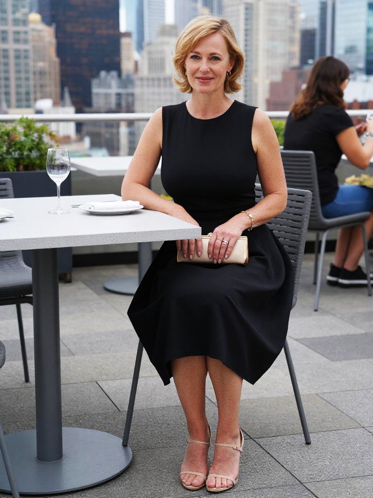 Photograph of a smiling blonde woman with short, wavy hair, wearing a sleeveless, black, knee-length dress and pink strappy heels. She sits at a white, round outdoor table on a tiled patio, holding a beige clutch. A clear wine glass is on the table. In the background, a woman with dark hair, dressed in black, sits facing away. The cityscape of tall buildings is visible in the distance under a clear sky. The overall style is modern and professional, with vibrant colors and sharp focus.
