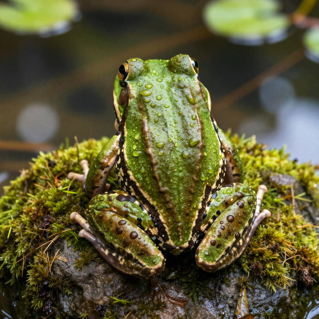 A vivid photograph of a green frog with black and yellow stripes, perched on a moss-covered rock. The frog is covered in tiny water droplets, highlighting its textured skin. The background is a blurred, dark water surface with green lily pads. The frog's legs are spread out, and its eyes are slightly closed. The moss is bright green and appears moist, contrasting with the dark rock beneath. The image is highly detailed and rich in color, emphasizing the natural, serene wetland environment.