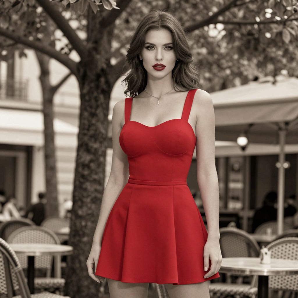 A svelte woman in a chic, solid red skater dress with a fitted waist, standing in a French cafe under a canopy of trees, sepia effect. Sexy. Pretty face and beаutiful eyes. Big breasts