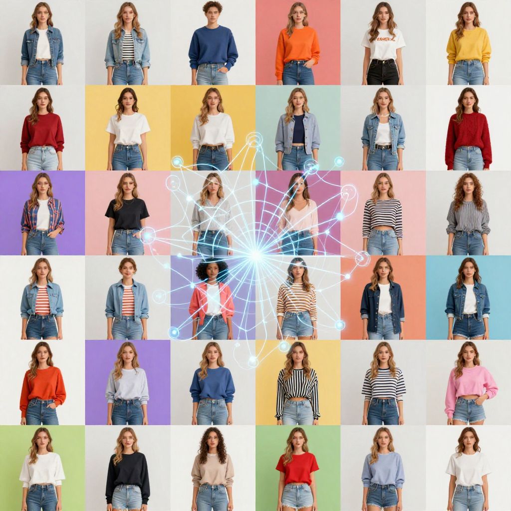 How to find clothes from pictures, a collage of different fashion photos linked by AI neural networks detecting patterns and garments, bright colors, stylish and modern clothing items, tech-inspired digital art