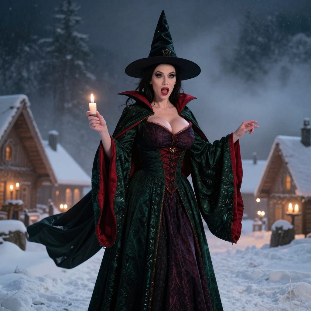 A cinematic real-life photo of a woman dressed as a wicked witch from the North, wearing a deep green and red witch costume with a flowing cloak, large witch-like features, and prominent exaggerated chest, posing dramatically in a snowy mountain village lit by flickering candles and winter fog. The woman has big tits and cute face