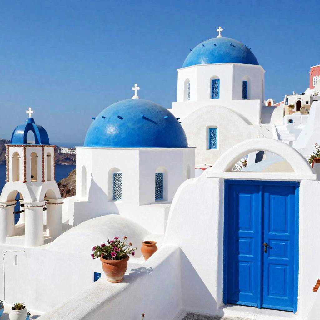 Photograph of a bright, sunny scene featuring white, curved, Cycladic-style buildings with blue shutters and arches. The buildings cast strong shadows on the smooth, gray pavement below. The clear blue sky contrasts sharply with the white structures, giving a vibrant, almost surreal feel. The image has a watermark in the center. The overall style is minimalist and modern.