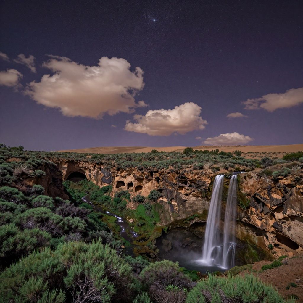 Photograph of a desert canyon with a tall waterfall, lush green shrubs, rocky cliffs, and a dark, starry sky with fluffy clouds.