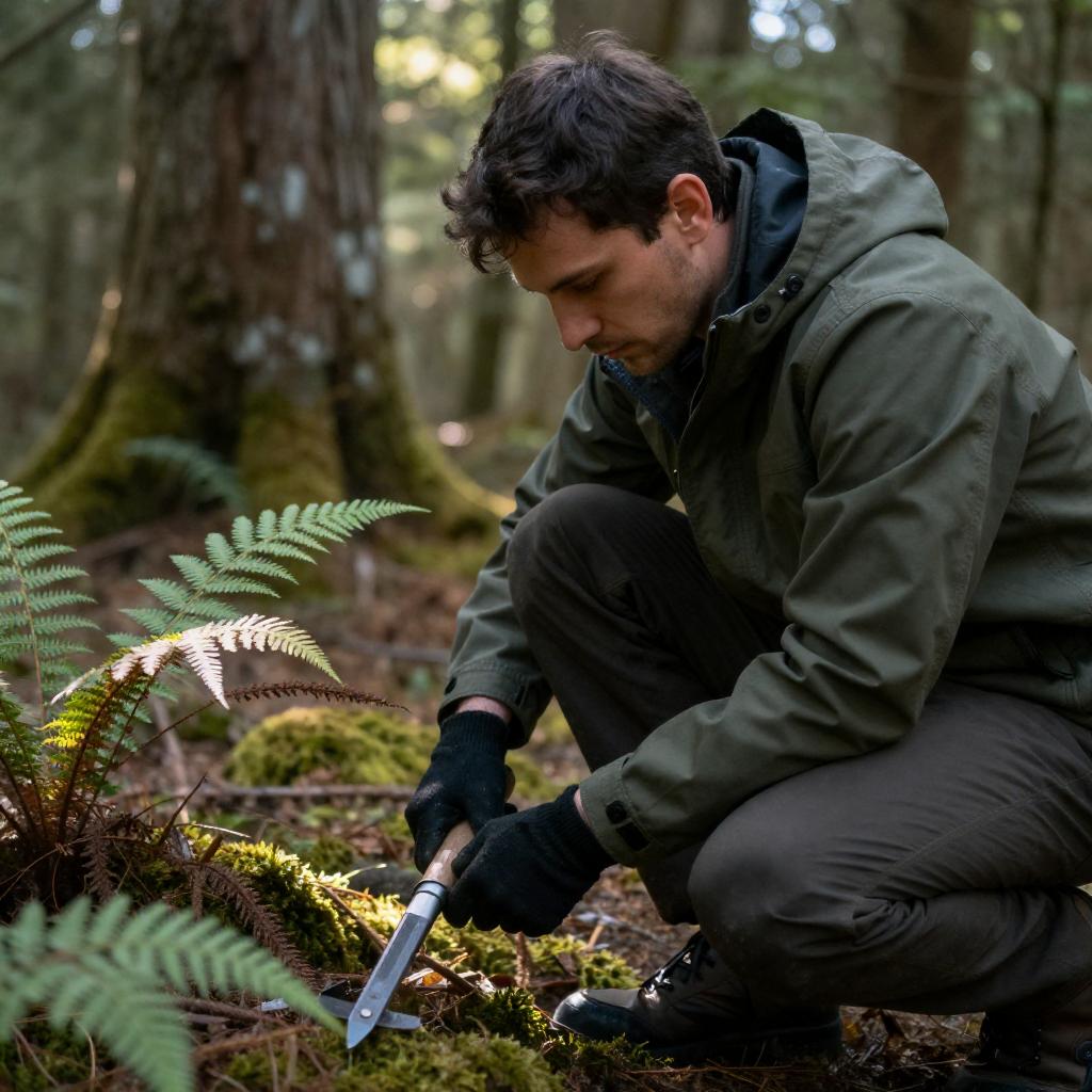 Photograph of a middle-aged man with short, curly brown hair, wearing a blue hoodie and jeans, bending over a red device connected to a blue laptop outdoors. He is using a screwdriver on the device, with a dark forest background and dry grass. The man appears focused and determined.