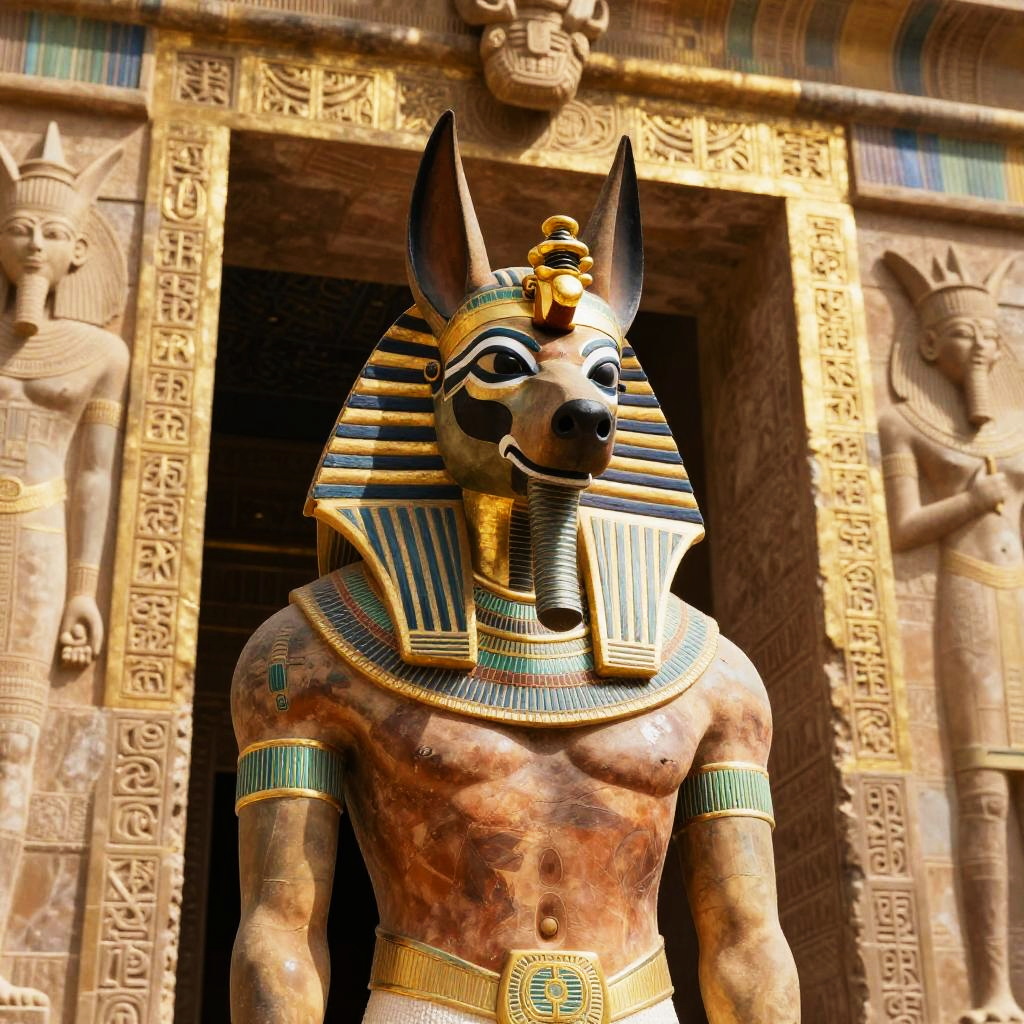 Half man half jackal guardian with fierce expression, ancient Egyptian headdress and jewelry, guarding a golden temple entrance with intricate carvings, detailed and vibrant colors