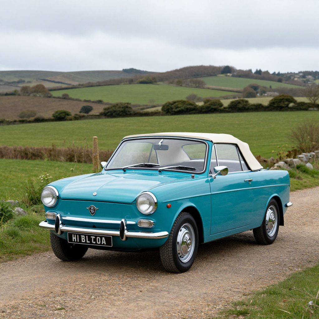 Photograph of a vintage, turquoise-blue convertible car with a white soft-top roof, parked on a gravel path in a lush, green countryside. The car has round headlights, chrome bumper, and a black license plate reading "HLB 960J." The background features rolling hills, grassy fields, and a cloudy sky. The car's shiny, smooth body contrasts with the rough gravel path and the natural, textured landscape. The classic car's design includes chrome accents and a small emblem on the front grille.