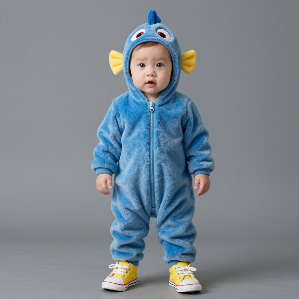 Pea pod costume infant, photograph of a cute baby with fair skin, wearing a yellow green hooded onesie that looks like a small dinosaur, baby is standing and looking directly at the camera with a neutral expression, gray background, soft lighting, realistic, simple, centered, child in costume, adorable, detailed ure on onesie, small single dinosaur spike on hood, minimal shadows, studio shot