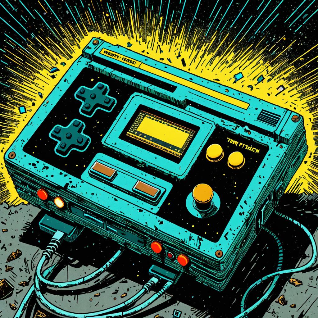 Italic A retro game console with glitching pixels, emitting chartreuse and deep pink lights, bulky and rugged, with a worn-out trembling joystick, fluorescent, rugged, grungy, layered, high resolution, hand-drawn comic book style, in the style of Moebius