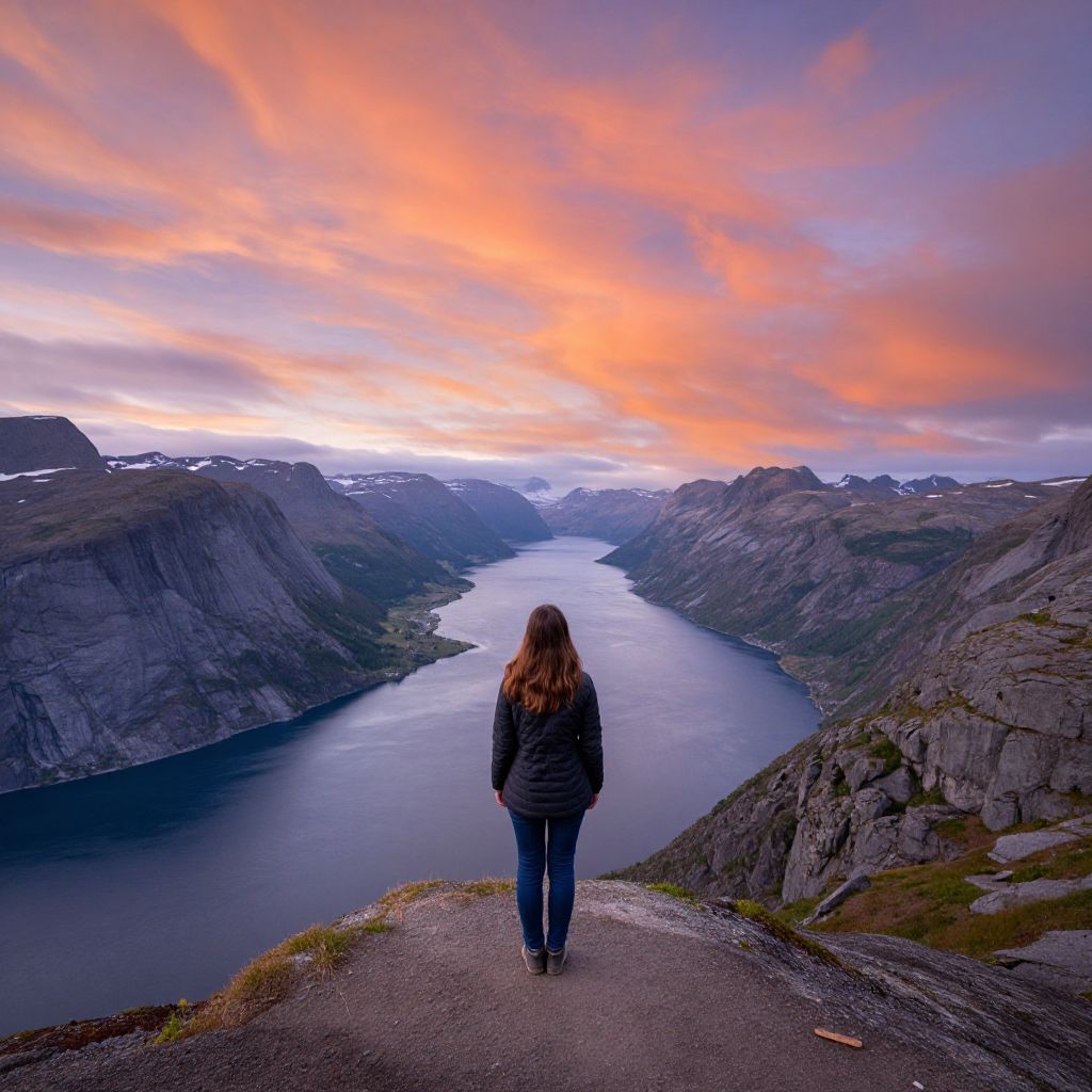 Photograph of a woman with long brown hair, wearing a dark jacket and blue jeans, standing on a rocky cliff overlooking a vast, dark blue fjord. The landscape features rugged, mountainous terrain with patches of snow on the peaks. The sky above is painted with vibrant, orange and pink clouds from a setting or rising sun, casting a warm glow over the scene. The woman is facing away, gazing at the expansive view. The ground she stands on is gravelly with sparse grass. The overall mood is tranquil and majestic.