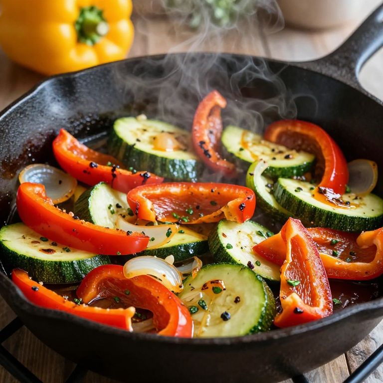 Sauteed vegetables sizzling in a cast iron skillet, vibrant colors of bell peppers, zucchini, and onions, steam rising, rustic kitchen background, warm natural lighting, close-up detail, fresh herbs sprinkled on top, golden-brown caramelization, home cooking aesthetic