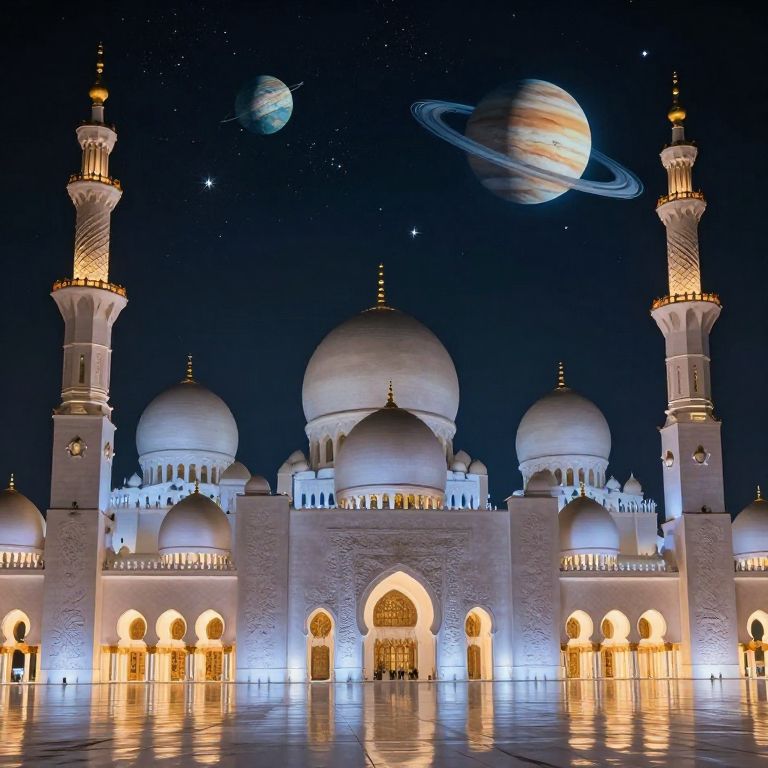 A futuristic Masjid at night, illuminated with stars and planets, featuring intricate details and beautiful color grading.