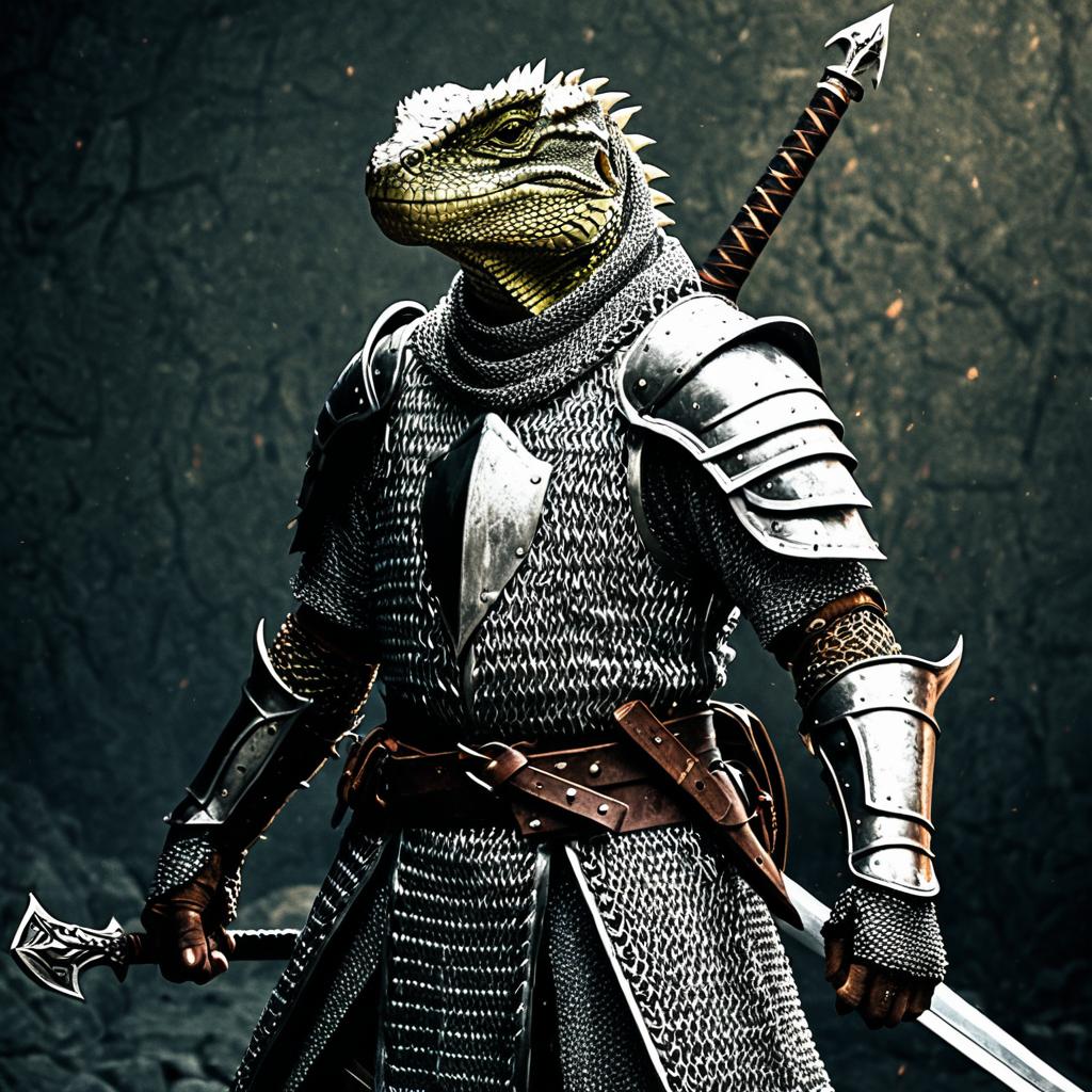 Detailed fantasy illustration of a lizardfolk knight wearing full chainmail armor with metal shoulder and arm guards. The knight holds a longsword and a mace, with a second sword strapped on the back. The lizard-like humanoid features reptilian skin with scales and a determined expression. The scene has a dark, textured background adding to the fantasy atmosphere, inspired by Dungeons & Dragons character art.