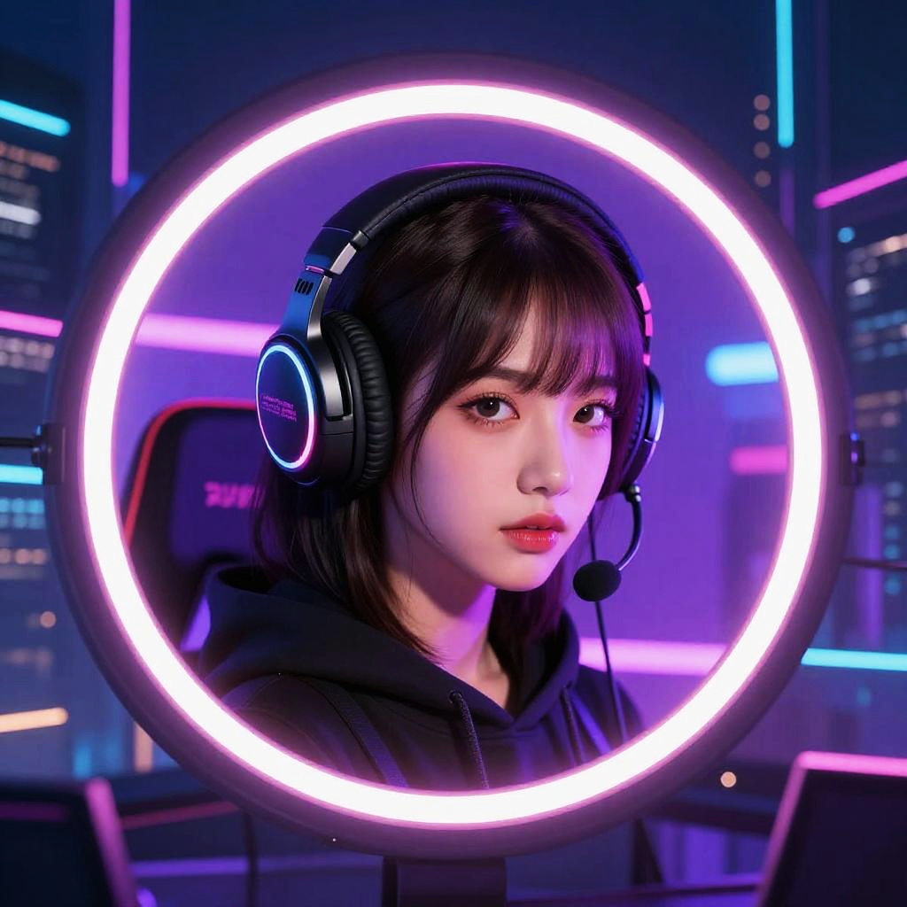 Gamer girl profile pic, vibrant neon colors, futuristic cyberpunk city background, confident expression, sleek headphones, sharp detailed digital art, dynamic lighting