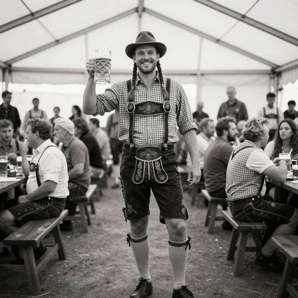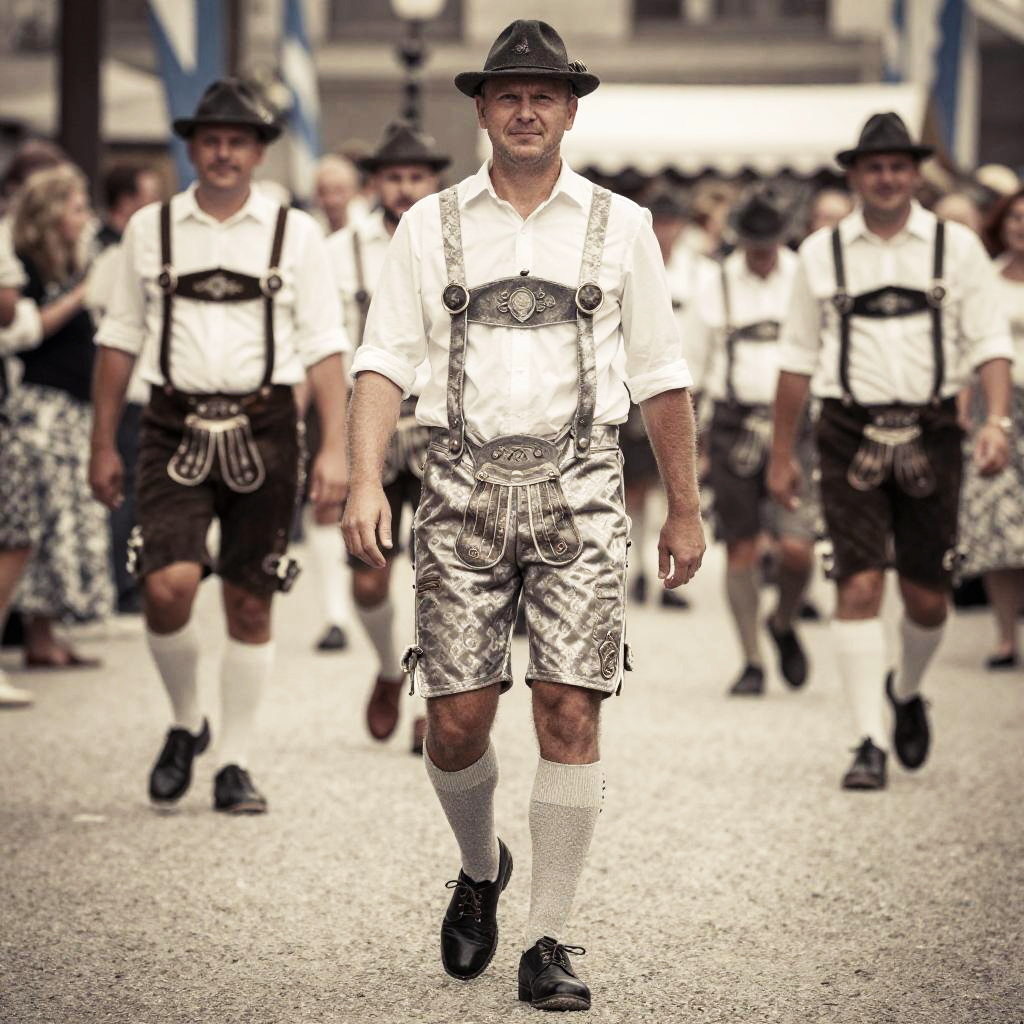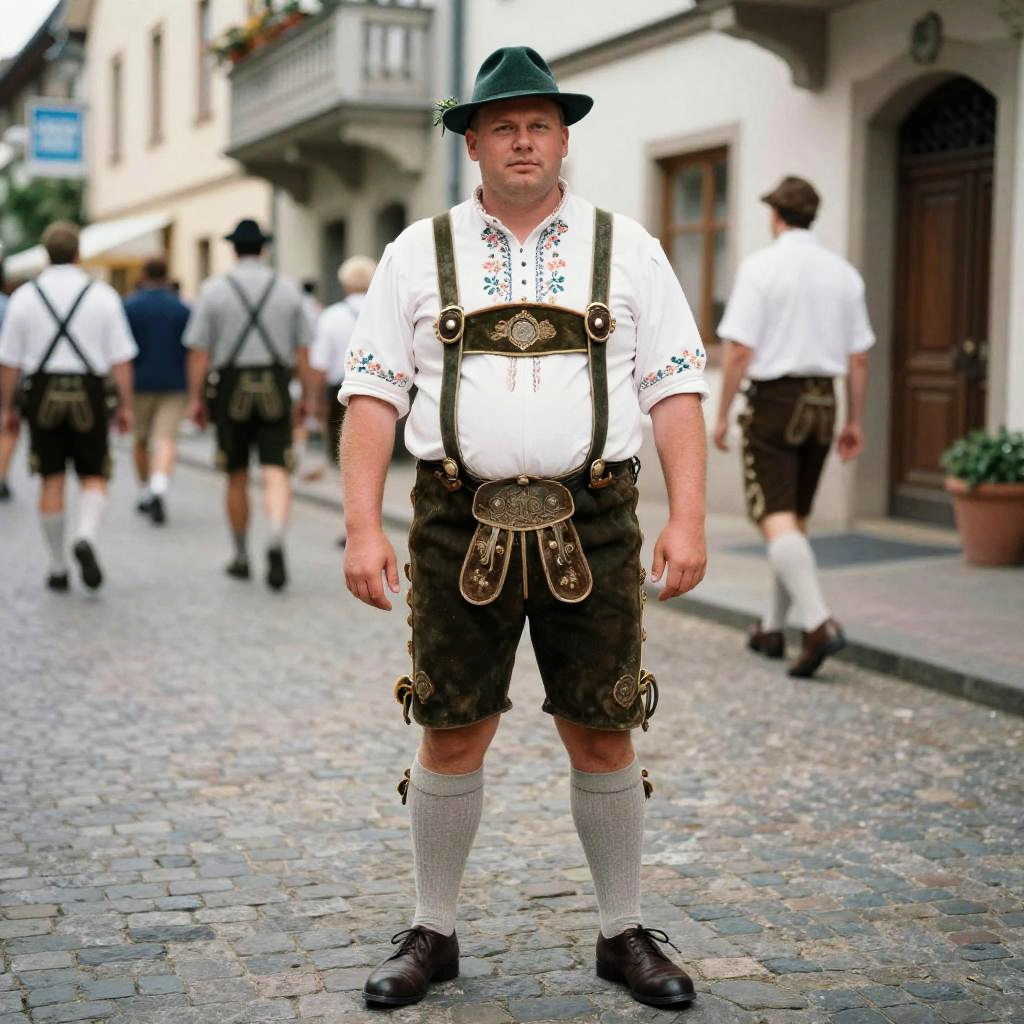 Photo of a Proportionate Body man, Slicked Back, Oktoberfest outfit, traditional Bavarian attire with Azure lederhosen made of Cotton, embroidered shirt, knee-high socks, boots, and an alpine hat, city square, modern analog photo