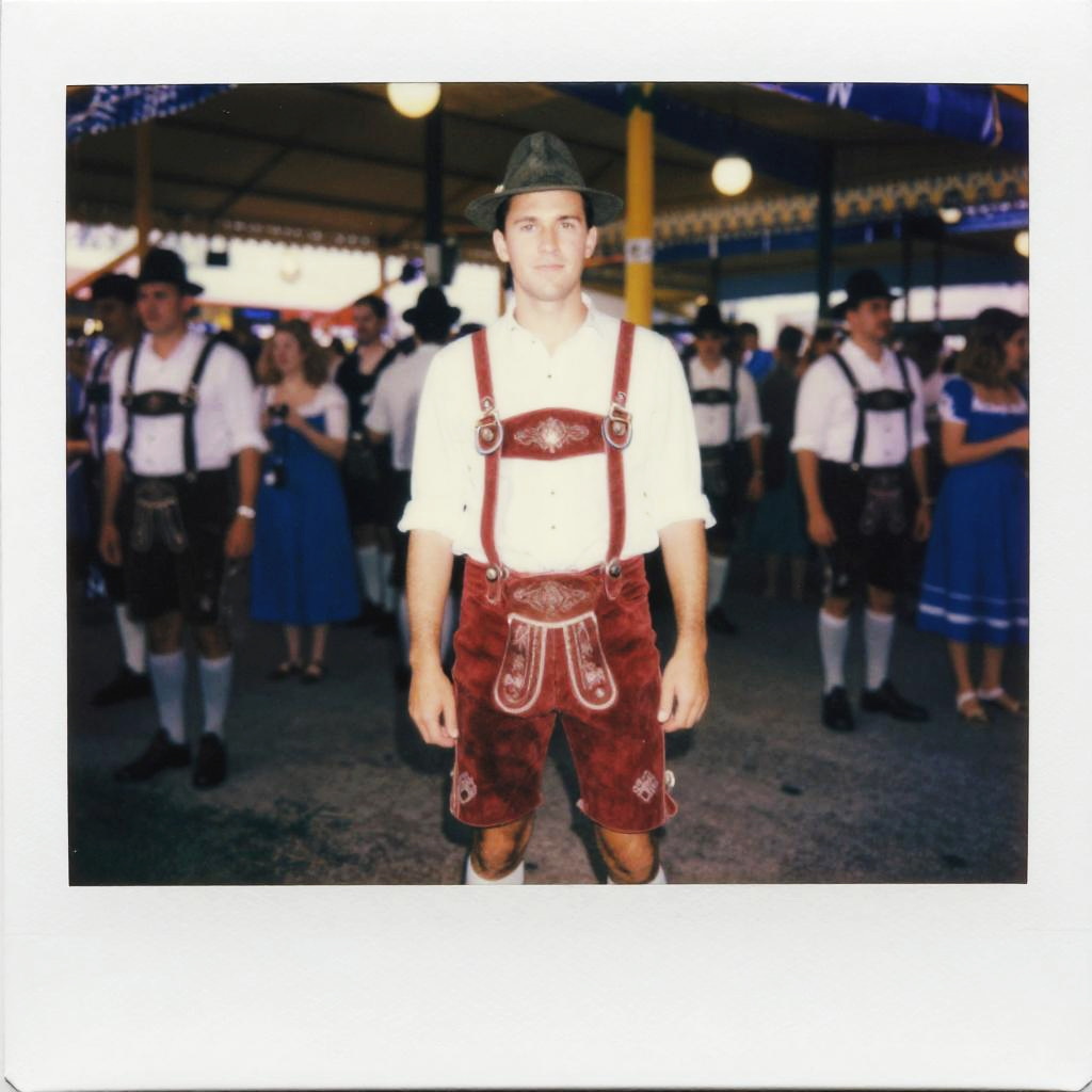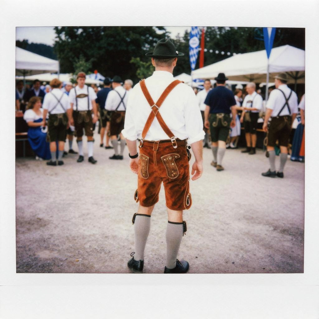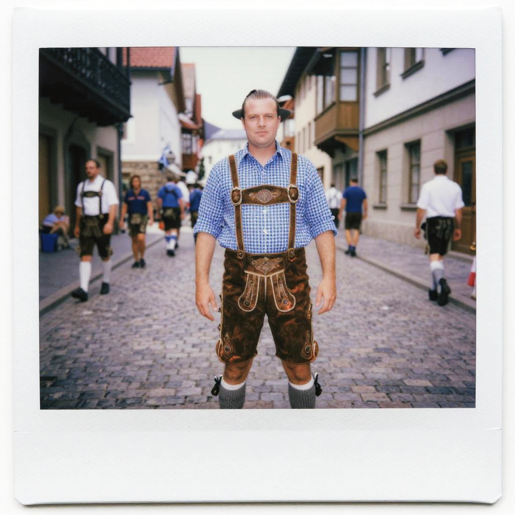 Photo of a Proportionate Body man, Slicked Back, Oktoberfest outfit, traditional Bavarian attire with Azure lederhosen made of Cotton, embroidered shirt, knee-high socks, boots, and an alpine hat, city square, modern analog photo