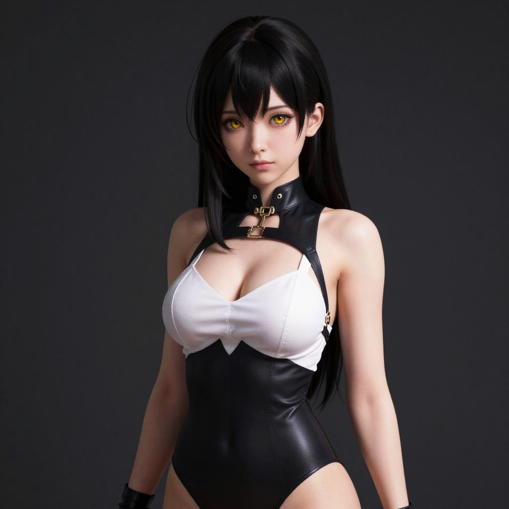 Absurdres, (realistic:1.5), (masterpiece, Extremely detailed CG unity 8k wallpaper, best quality, highres:1.2), (ultra_detailed, UHD:1.2), (pixiv:1.3), perfect illumination, distinct, (1girl:1.4), (bishoujo:1.2), looking at viewer, unreal engine, sidelighting, perfect face, detailed face, perfect body, beautiful eyes, pretty face, (bright skin:1.4), (abs), (navel), black hair, long hair, (yellow eyes:1.1), (large breasts:1.1), bodysuit, higheels, shiny clothes, skin tight, hair intakes, covered breasts, sideboob, cleavage