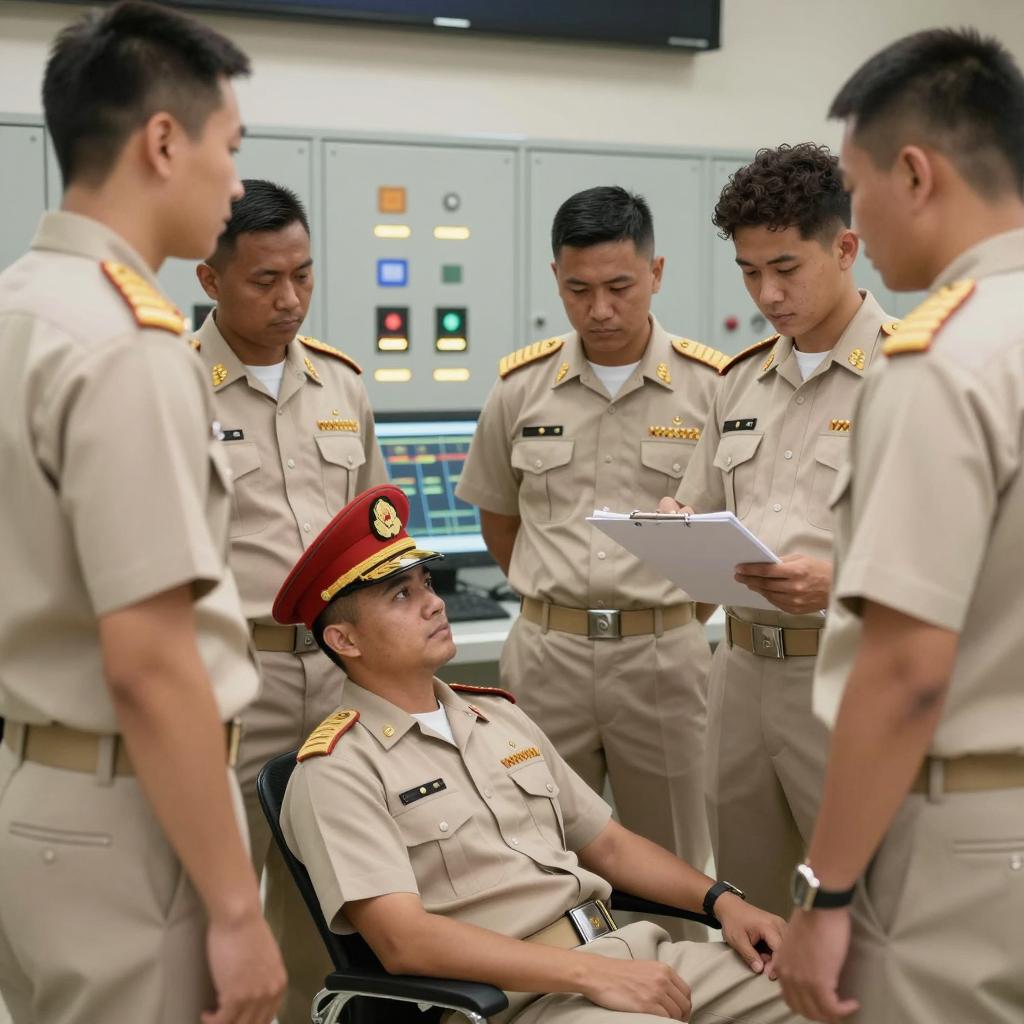 Six male military personnel in beige uniforms gathered indoors, engaged in a discussion. One man wearing a red cap and sitting on a chair appears to be the commander, while the others stand around him, one holding a clipboard. Background features illuminated control panels, suggesting a command or operations room. All men have short hair, with one having curly hair.