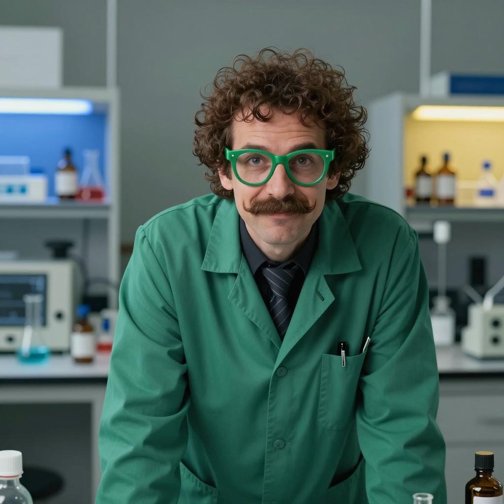Two men in a laboratory. The man facing the camera has short brown hair, light skin, green tie, red vest, white lab coat. The man with his back to the camera has dark hair, green hat, light blue shirt, light gray vest. Both are talking. Background includes colorful, cylindrical equipment with pipes and cables.