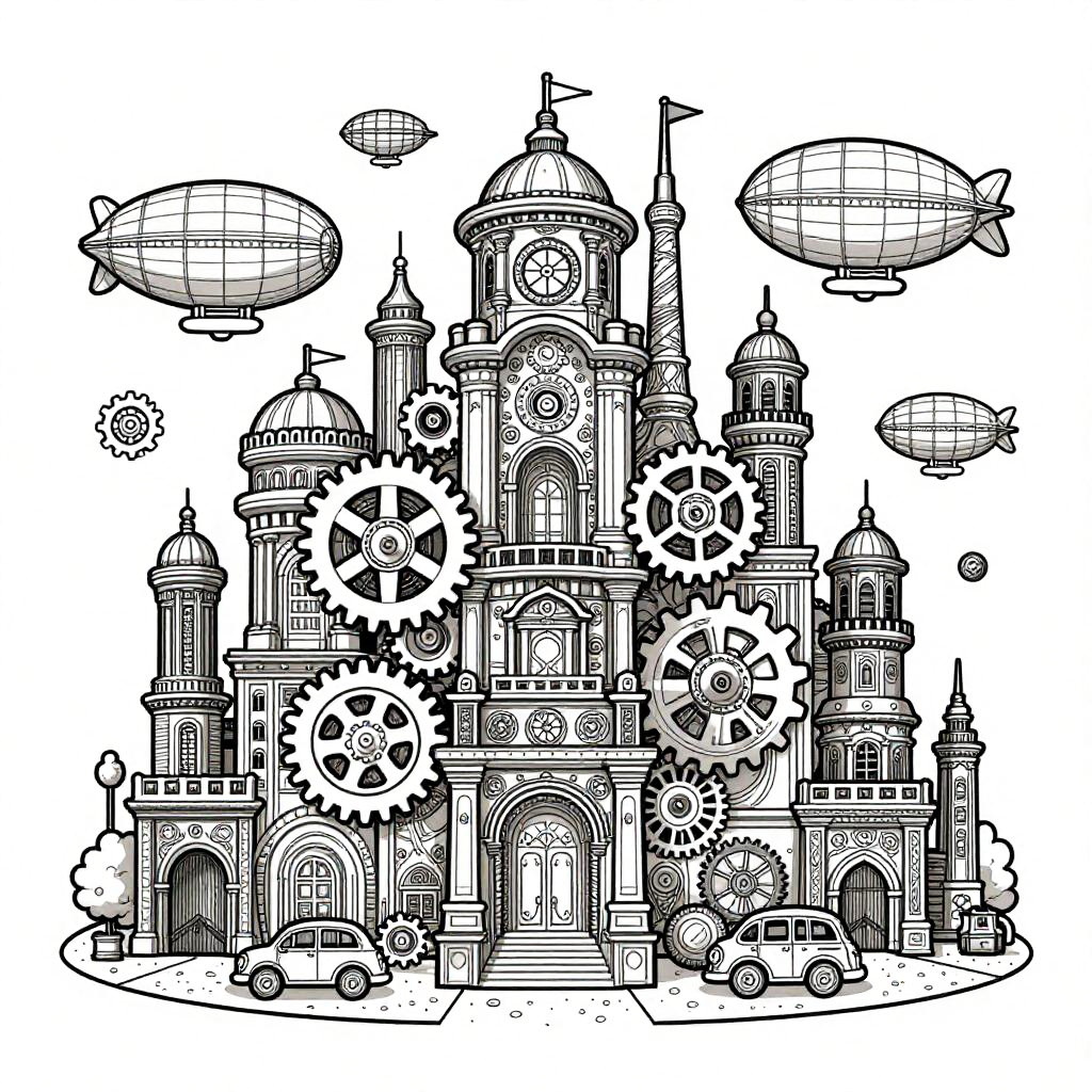 Midjourney coloring book prompt showcasing a bustling steampunk cityscape with elaborate gears and airships, rendered in clear outlines for coloring, inviting imagination and creativity through complex patterns and magnificent architecture.