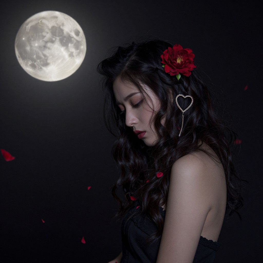 In this captivating image, a woman with dark, intricate hair adorned with red flowers and a heart-shaped accessory stands gracefully against a deep, textured background. Her gaze is directed downward, exuding a sense of introspection and melancholy. The moon, a large, luminous circle, hangs in the upper left corner, casting a soft glow that contrasts with the dark, almost ominous tones of the surroundings. Red petals, scattered around her, add a touch of vibrancy and depth to the composition. The overall scene is a harmonious blend of natural elements and celestial bodies, creating a surreal and evocative atmosphere.