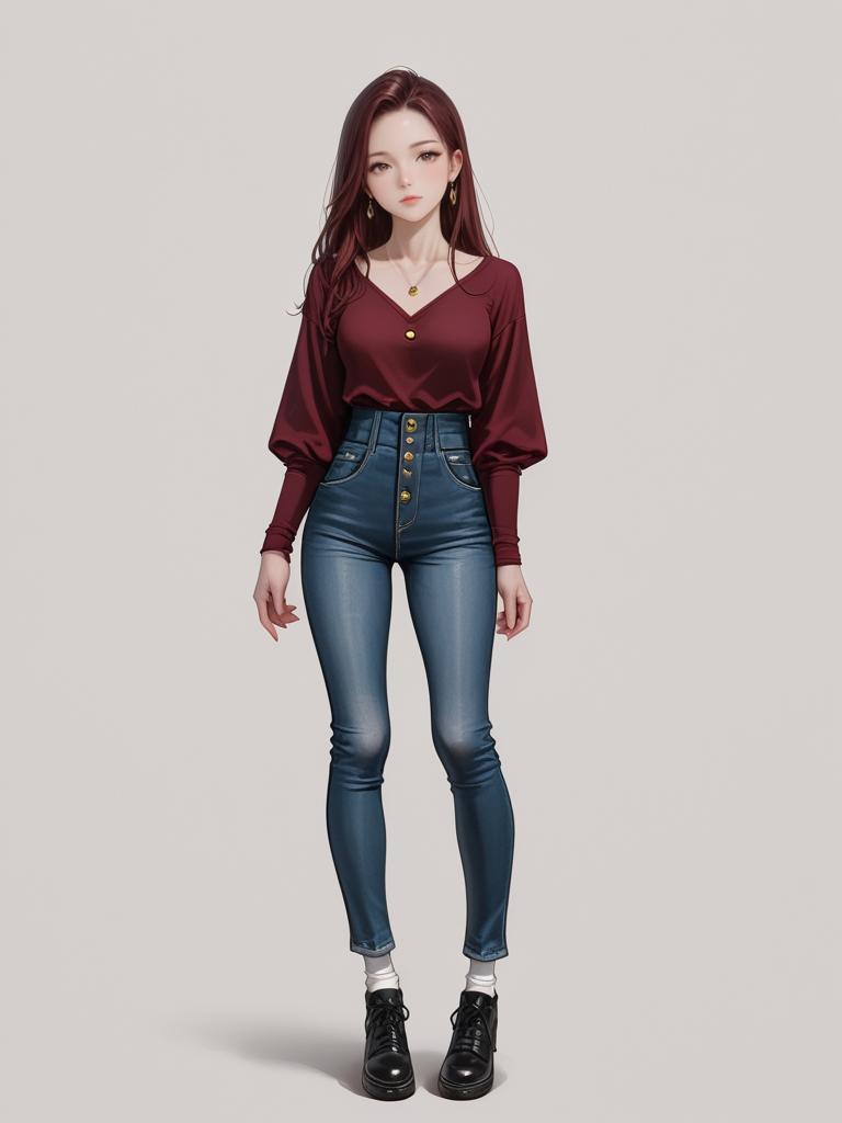Young professional female, wearing a black turtleneck sweater, an extravagant maroon cable knit cardigan with highly detailed attire, pale skin, high fashion modern whole body drawing, realistic female anime portrait, Barbie-inspired, outfit featuring a maroon and gray dominant palette, harness, choker, black net socks, silver accessories, platform heels, minimalistic background, eye-catching and stunning, cute face, looking at viewer, tattoo