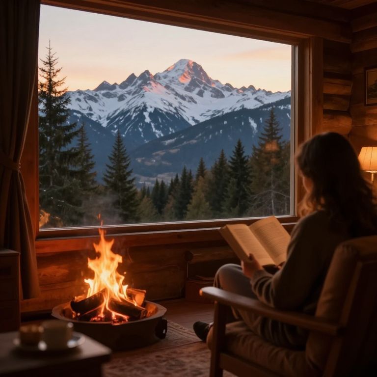A charming alpine cabin with a thatched bar built into the side of the mountain, nestled in pine trees and snow-dusted peaks; a young couple with warm, laughing faces sits on a low wooden seat nearby, sipping hot chocolate, the bar glowing softly under the soft winter light.