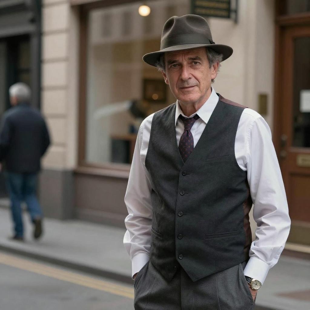 An older man wearing a dark brown fedora hat, white dress shirt, dark vest, patterned tie, and gray pants stands on a city street with his hands in his pockets. The background shows an urban setting with blurred storefronts and another walking person.