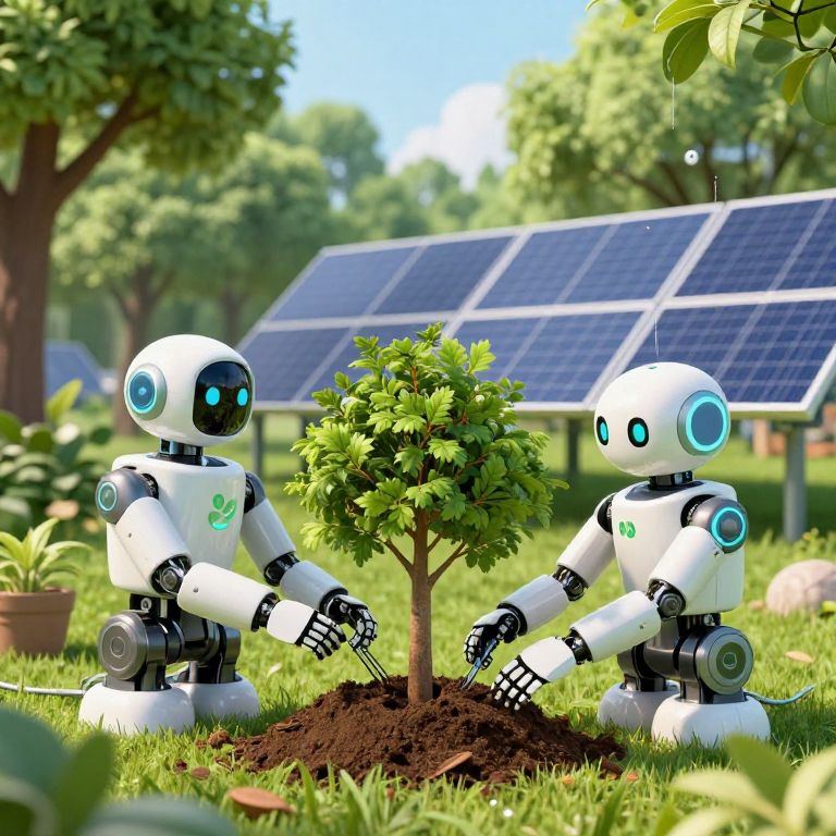 AI generated images for commercial use illustrating eco-friendly technology innovation, with AI-driven robots planting trees and managing renewable energy resources in a lush, green environment, combining nature and technology seamlessly.