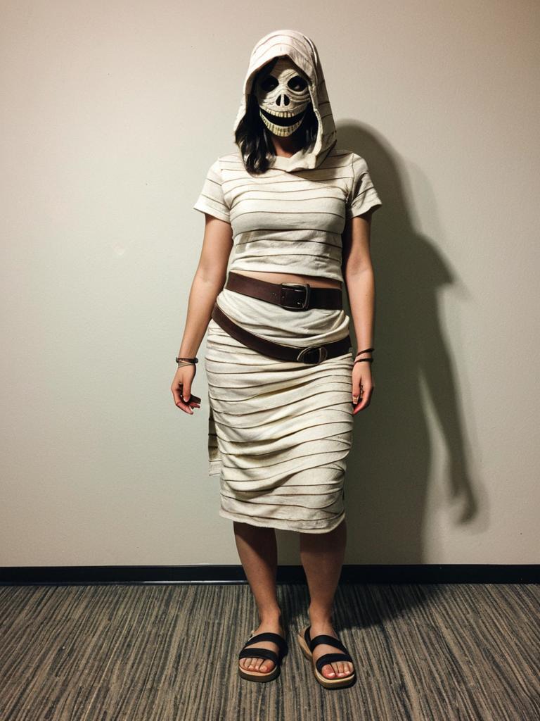 Mummy costume skirt, 1girl, solo, sandals, standing, full body, cosplay, realistic, looking at viewer, parody