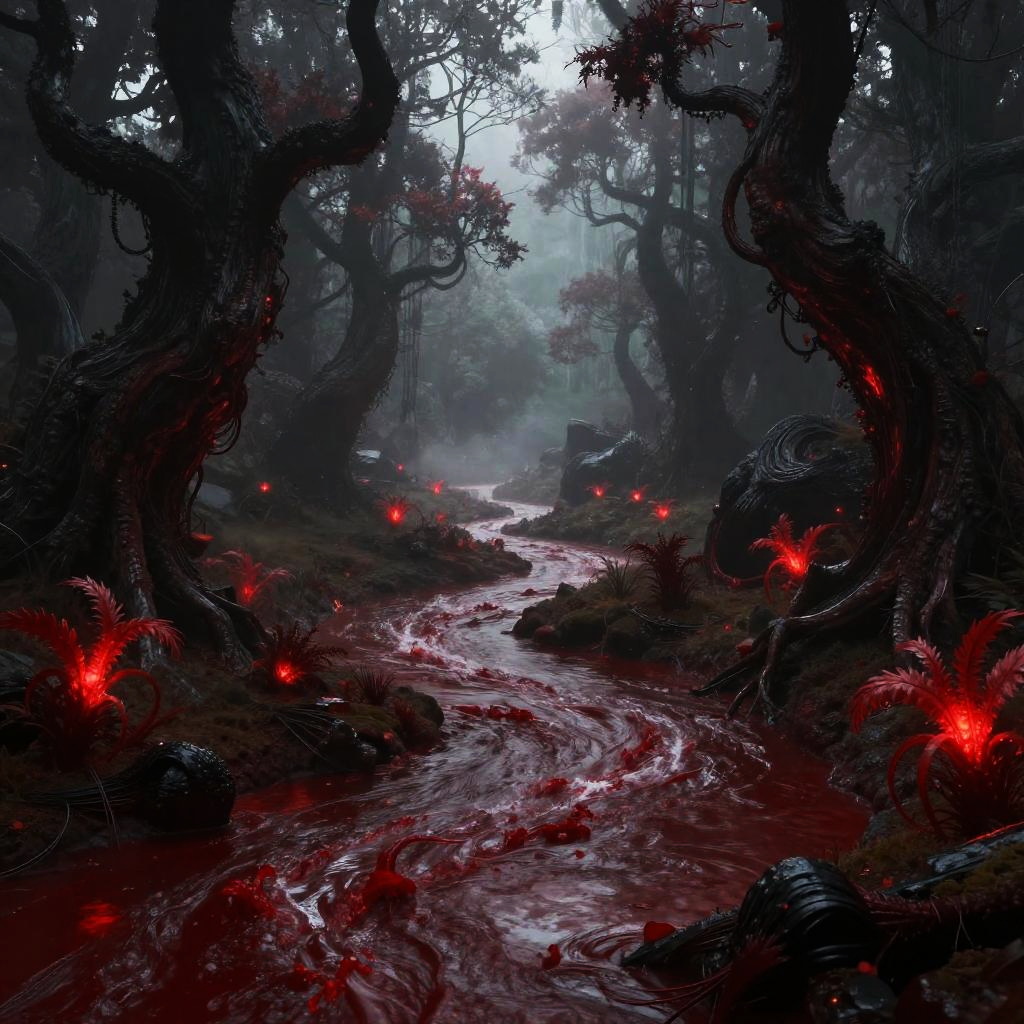 Sanguineo-themed fantasy landscape, blood red rivers flowing through dark, twisted trees, glowing red flora illuminating the foggy surroundings, mysterious and otherworldly atmosphere, highly detailed environment with a moody color palette.