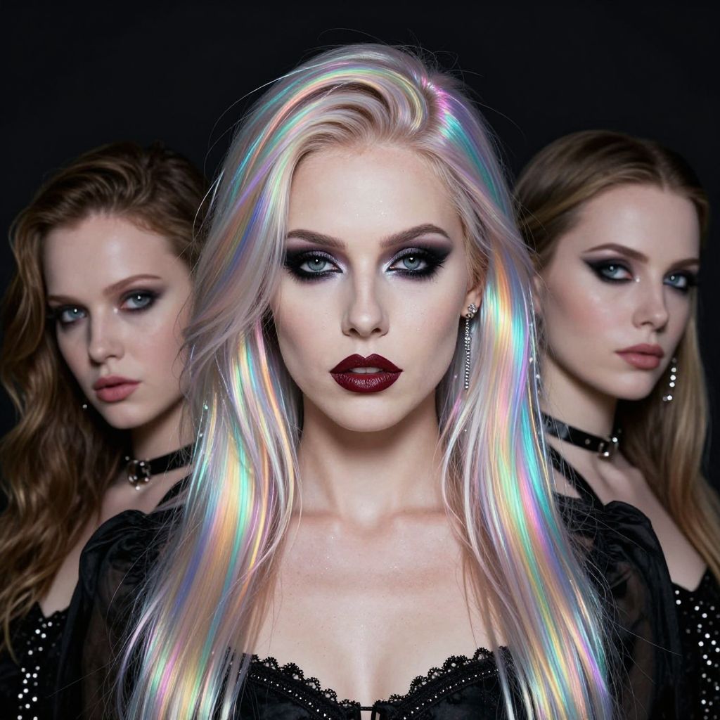 Photograph of a striking woman with long, iridescent blonde hair, intense blue eyeshadow, and dark red lipstick, standing in the center. She wears a black lace top and choker. Flanking her on both sides are two women with lighter brown hair, matching dark makeup, and black lace tops. The background is dark, emphasizing the neon-like hair and dramatic makeup. The image has a high-contrast, gothic-glam aesthetic with a focus on the central figure's luminous hair.