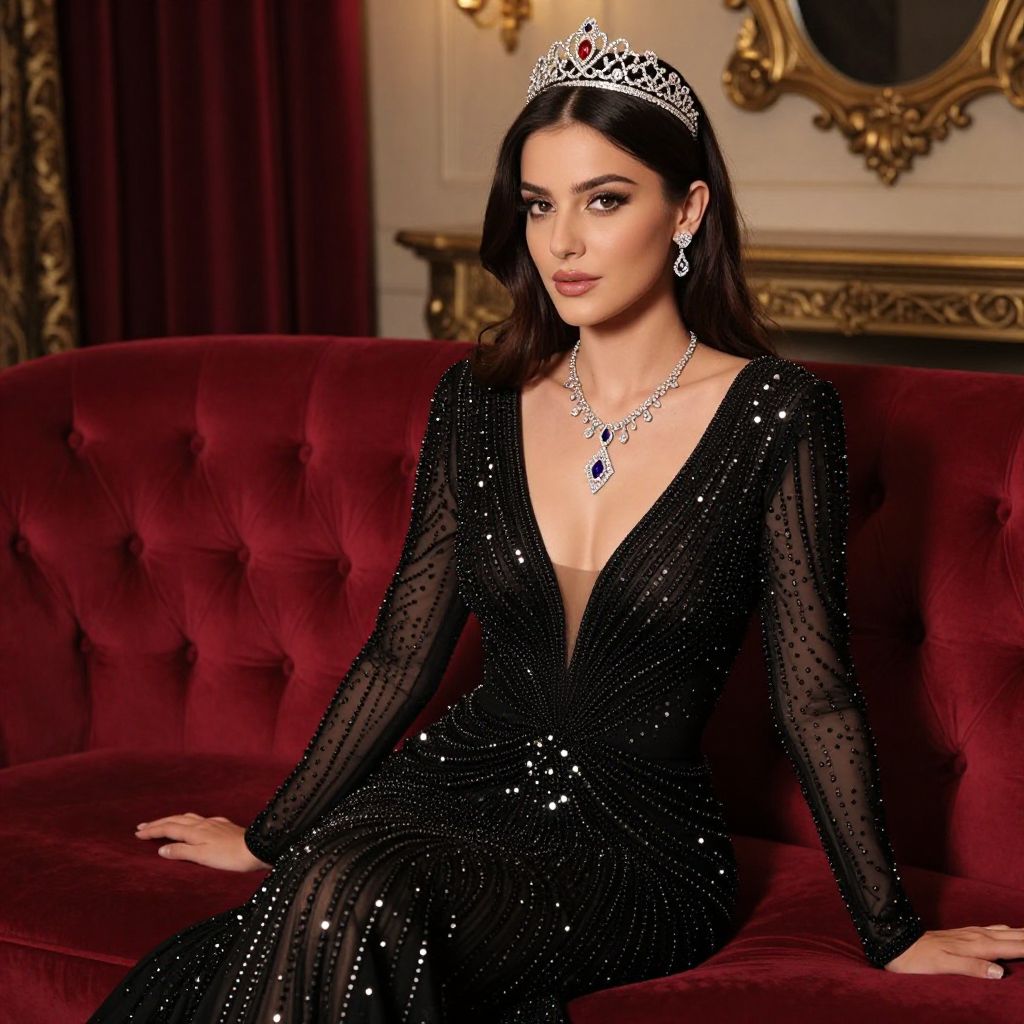 Elegantly seated on a plush red velvet couch, a woman adorned in a sparkling black dress embellished with intricate beadwork and a matching necklace, accessorized with a regal tiara and diamond earrings, exudes timeless sophistication against the backdrop of warm ambient lighting and ornate decor.