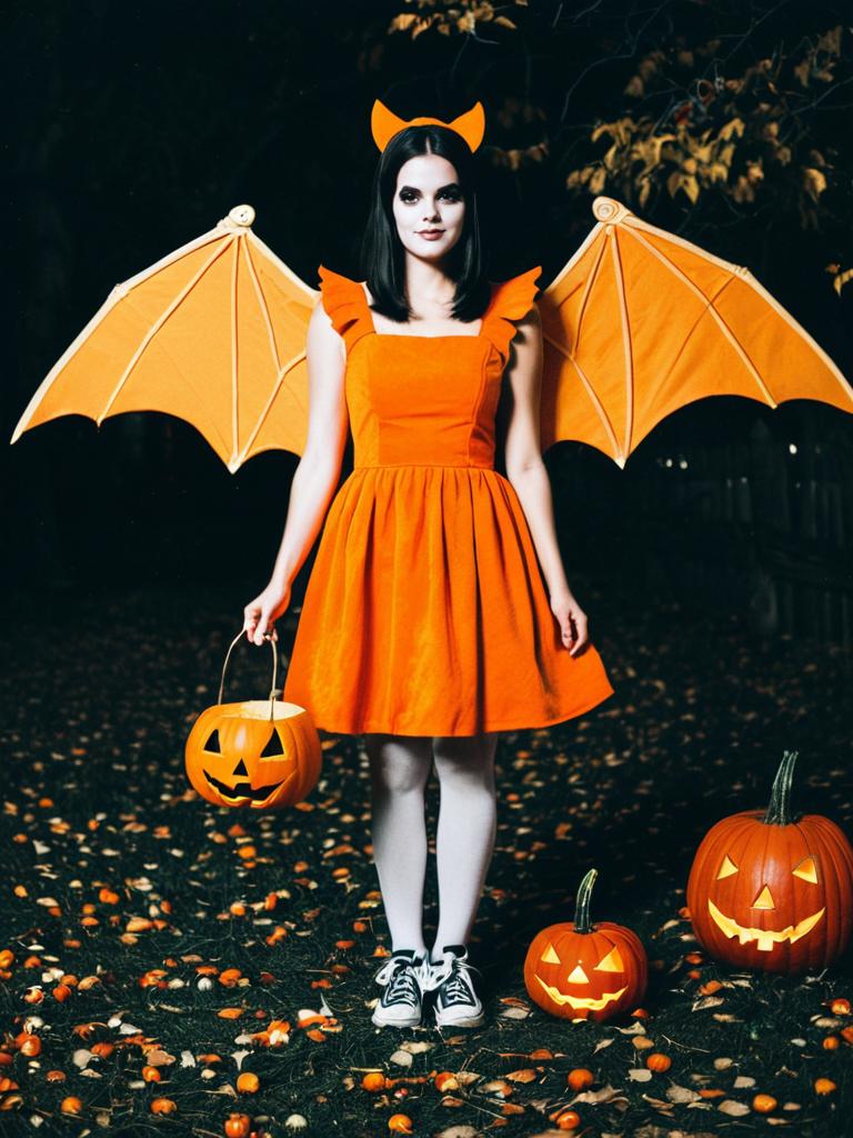 Basic halloween costume, solo, head wings, wings, halloween, orange dress, dress, jack-o'-lantern, 1girl, pumpkin, male focus, shoes, realistic
