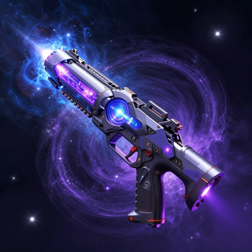 Astral blaster weapon glowing with cosmic energy, sleek futuristic design, surrounded by swirling stars and nebulae, vibrant purple and blue color palette, sci-fi style