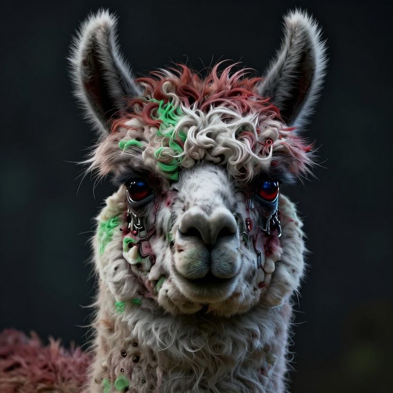 Photograph of a close-up llama with a dark background. The llama has fluffy, curly fur in white, red, and green colors, with a white nose and dark, expressive eyes. Tears are streaming down its face, adding a melancholic expression. The fur is textured and detailed, with the colors creating a vibrant contrast against the dark, blurred background. The llama's ears are upright, and its gaze is directly at the camera, creating an intense, emotional connection. The image is highly detailed with a slightly surreal, hyper-realistic style.