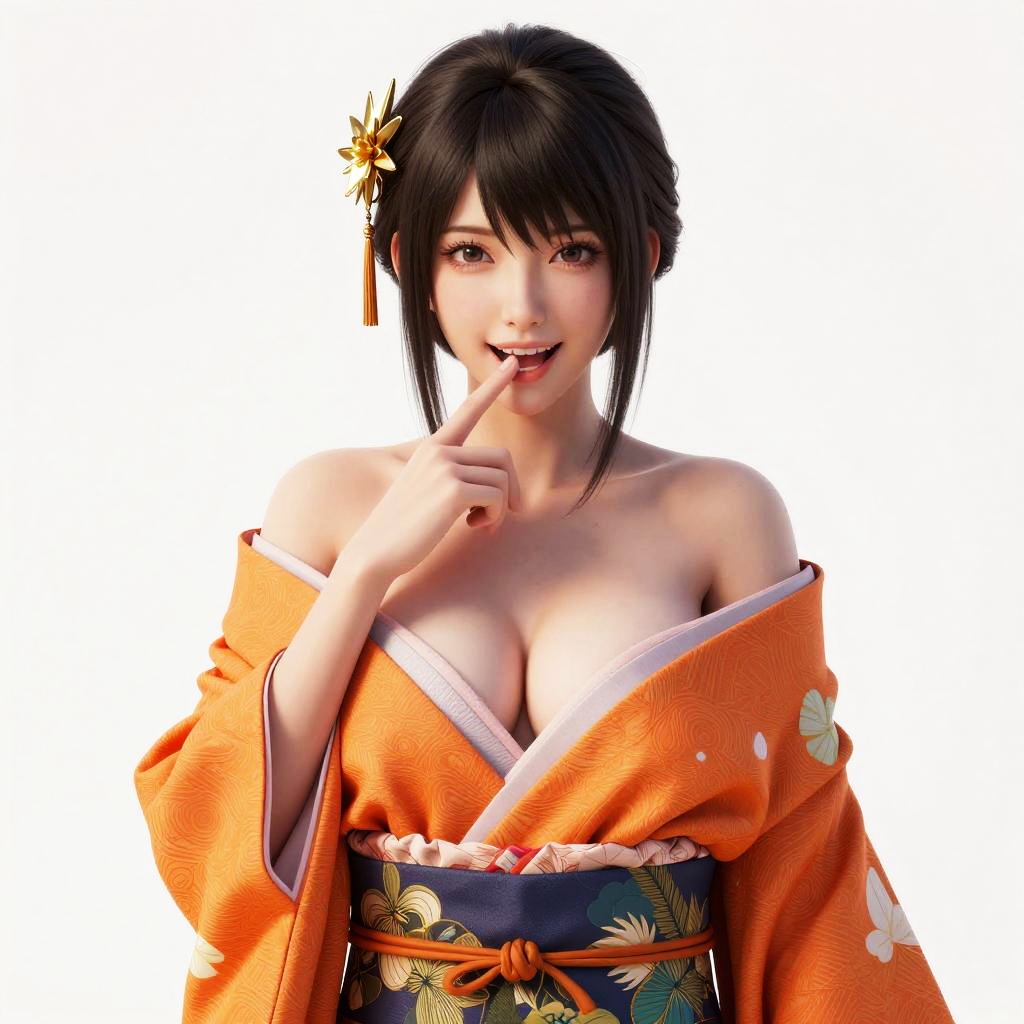 Digital artwork of a young woman wearing an orange kimono with floral patterns and a dark blue obi belt. She has dark hair styled with a golden hair ornament and is posing with one finger near her lips, smiling softly. The image features bare shoulders, a cleavage accentuated by the off-shoulder style kimono, and a white background.