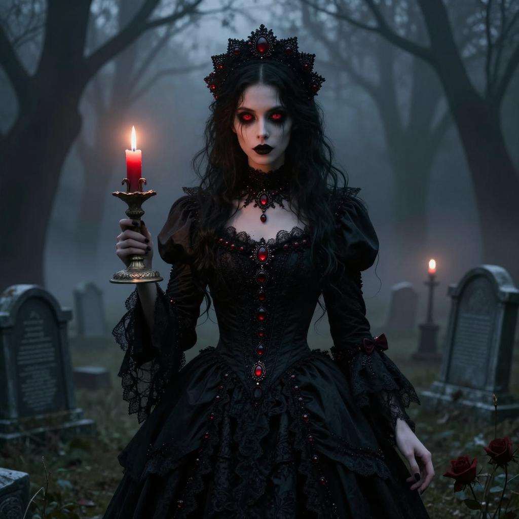 A gothic dark sorceress with piercing red eyes, wearing an elaborate black dress adorned with red details. She holds a glowing, ornate red lantern, standing in a misty graveyard with tall trees and a gothic mausoleum in the background. The scene is illuminated with dramatic, moody lighting enhancing the mysterious and eerie atmosphere.