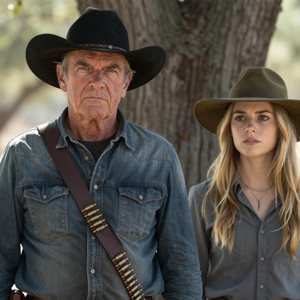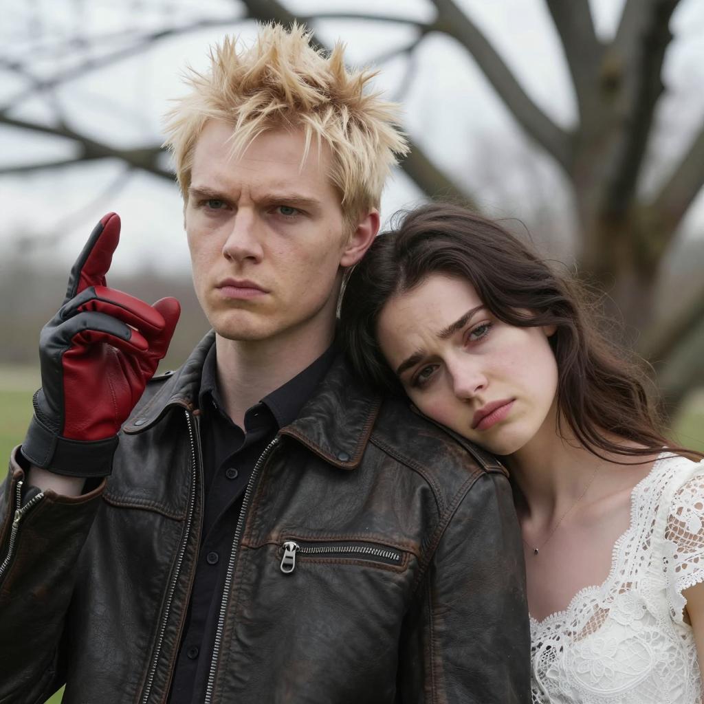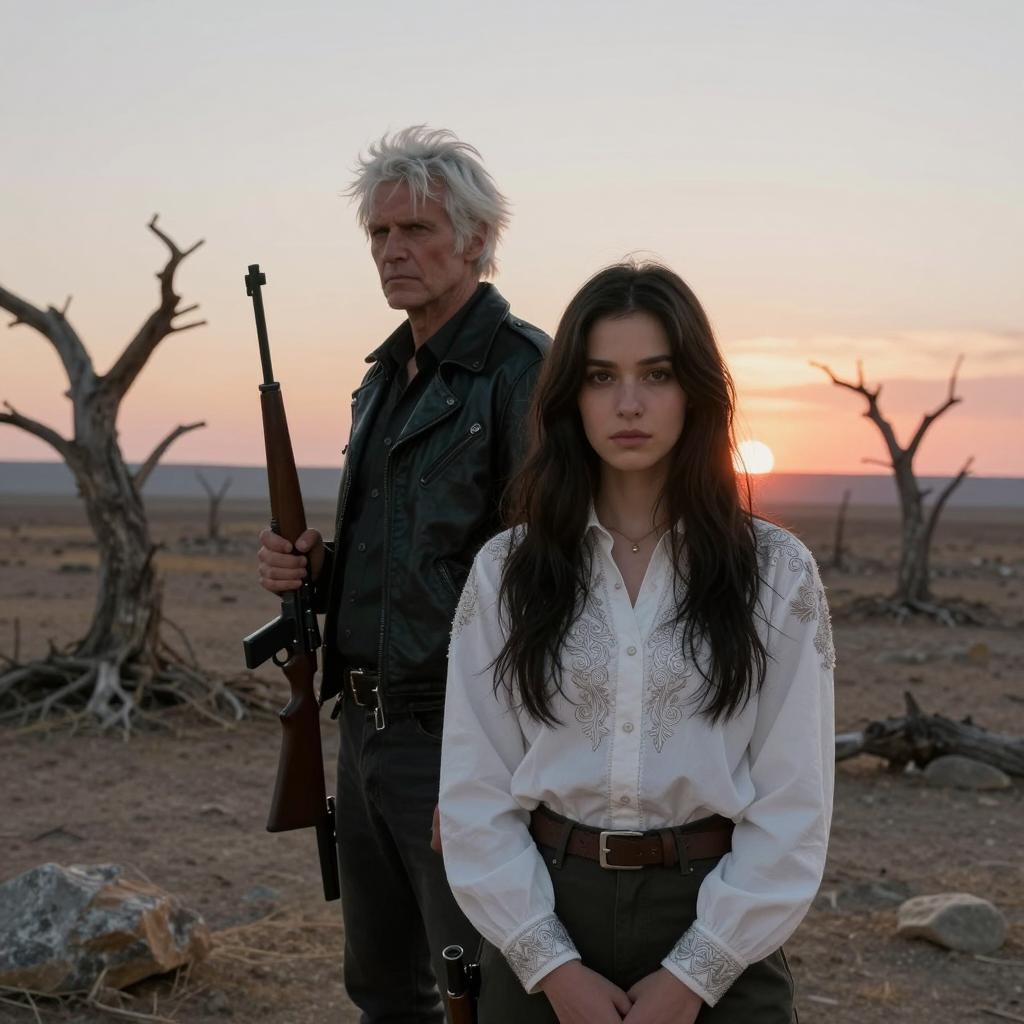 Two people in a desolate, barren landscape with a sunset sky. The man in the background has wild, white hair, wears a black leather jacket, and holds a rifle. The woman in the foreground has long dark hair, wears a white shirt with intricate silver embroidery, and stands with hands clasped. Leafless, twisted trees and rocks surround them.