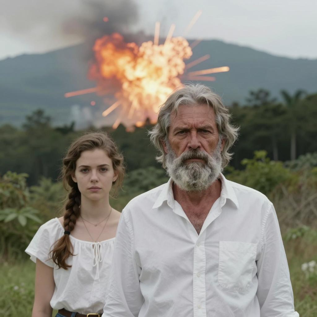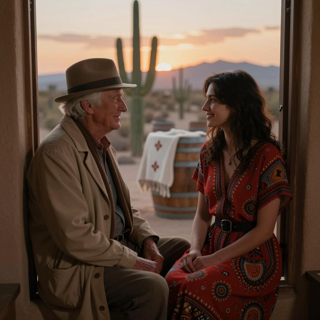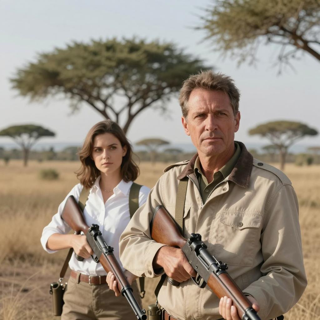 Two people in a desolate, barren landscape with a sunset sky. The man in the background has wild, white hair, wears a black leather jacket, and holds a rifle. The woman in the foreground has long dark hair, wears a white shirt with intricate silver embroidery, and stands with hands clasped. Leafless, twisted trees and rocks surround them.