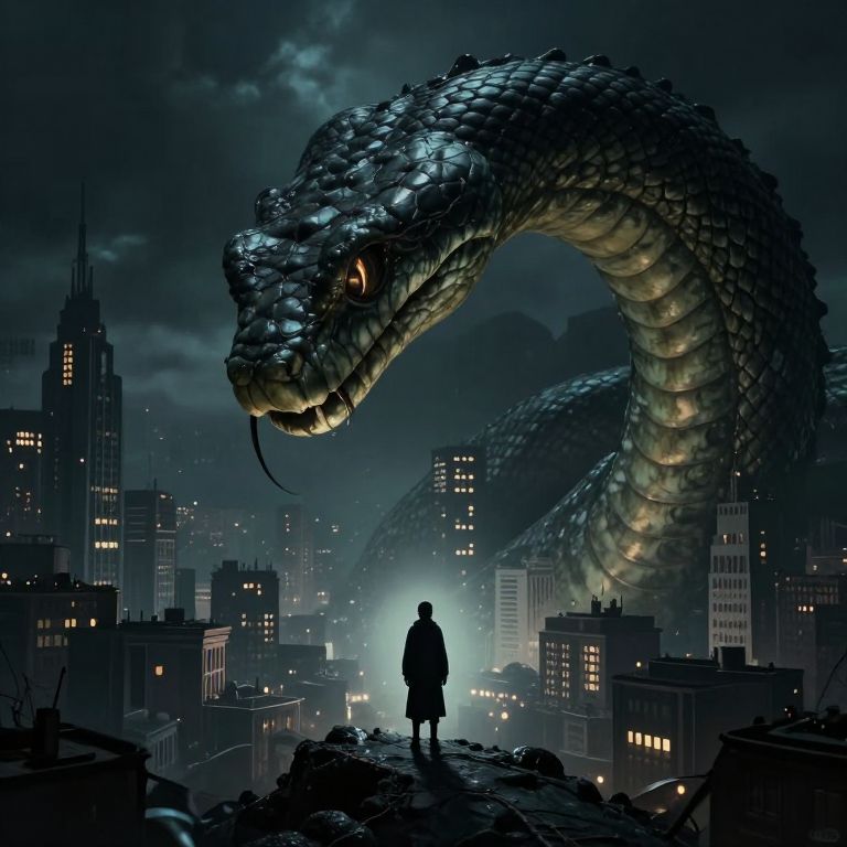Digital art depicting a giant, glowing blue and green snake with a menacing expression looms over a dark, cloudy night cityscape. The snake's scales are detailed and shimmering. A silhouette of a lone person stands on a rooftop in the foreground, gazing up at the enormous creature. The city is filled with tall buildings, some with lit windows, creating a contrast between the tiny human and the massive snake. The scene is illuminated by a bright, eerie light source in the background, enhancing the dramatic atmosphere. The overall mood is eerie and fantastical.