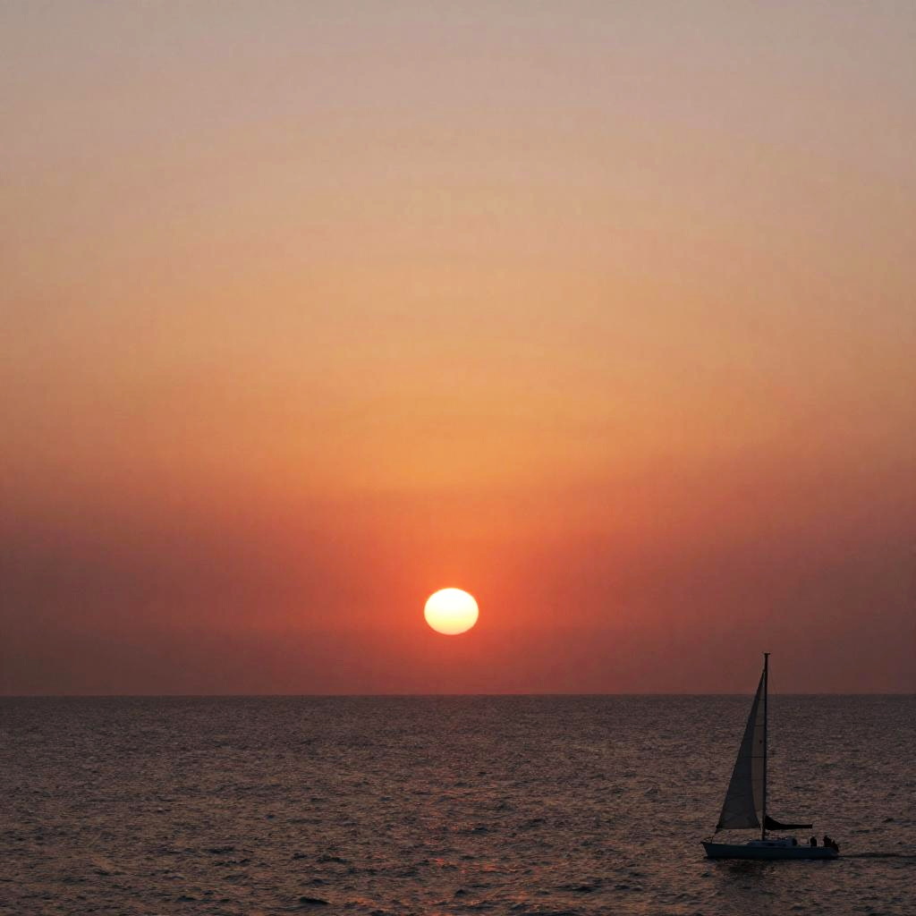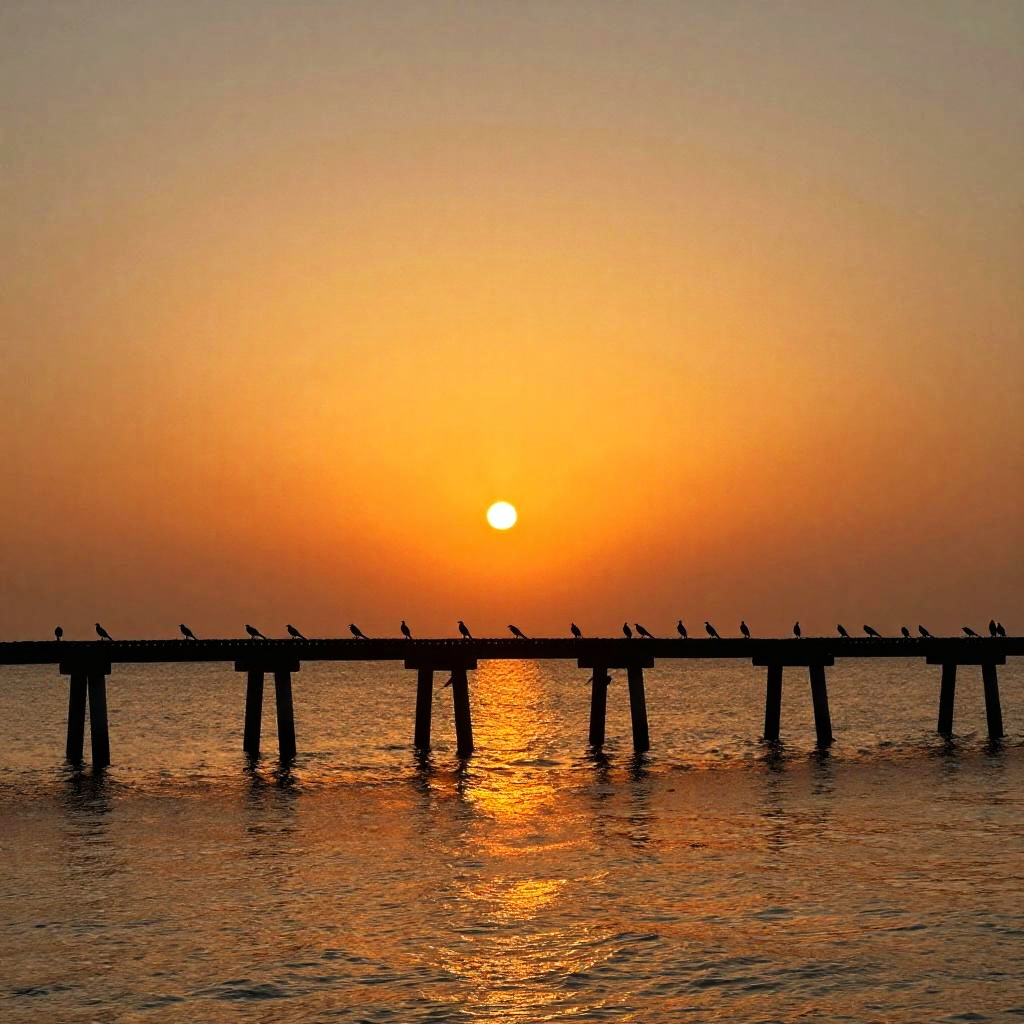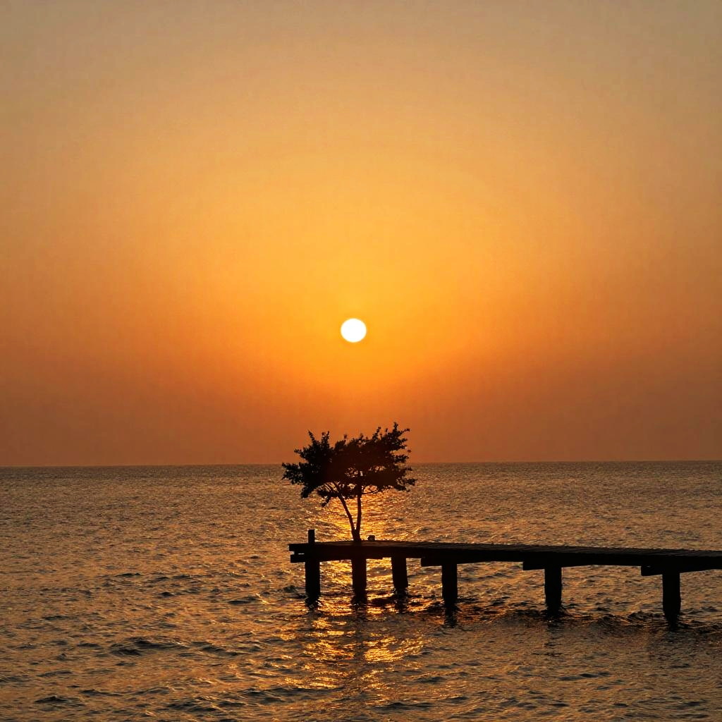 This is a digital artwork of a sunset over a calm water body. The sky transitions from pink to orange to deep red, reflecting beautifully on the water. Silhouetted wooden poles stretch horizontally across the image, creating a mirror-like reflection. The overall vibe is serene and peaceful, with a focus on the vibrant colors and reflective water.