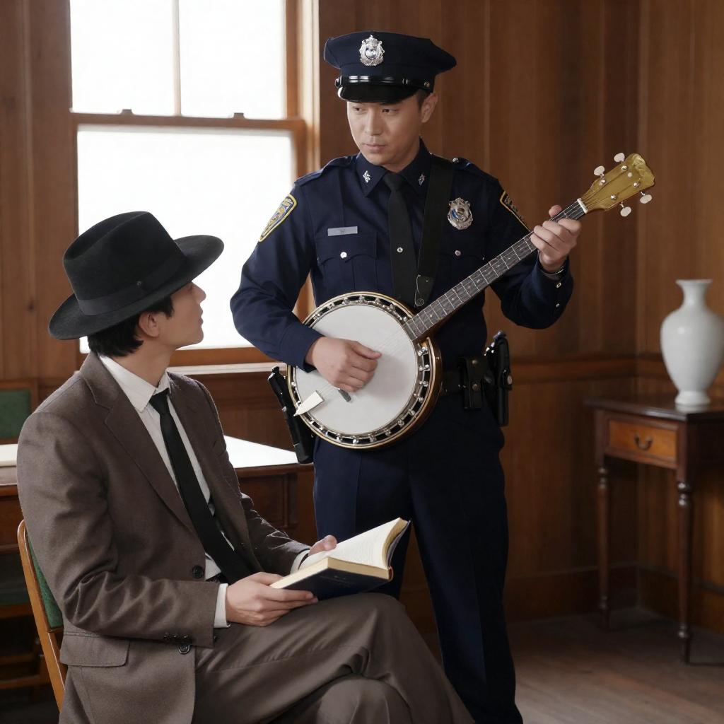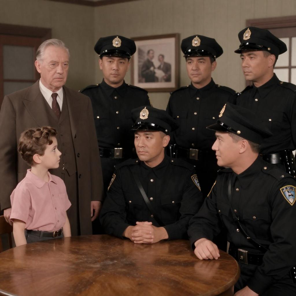 Photograph of a 1940s-style movie still featuring a group of six men in black police uniforms with hats, standing and sitting around a wooden table. An older man in a brown coat and a young boy in a pink shirt stand to the left. The background shows a wooden wall with a framed picture. The men have serious expressions, and the boy looks up at them.